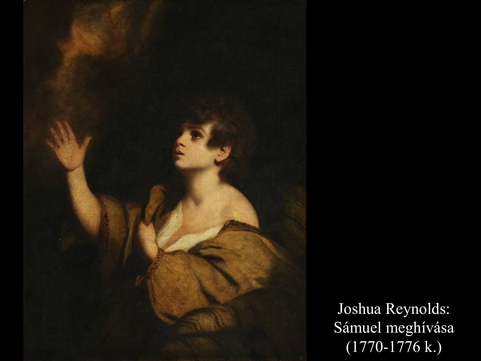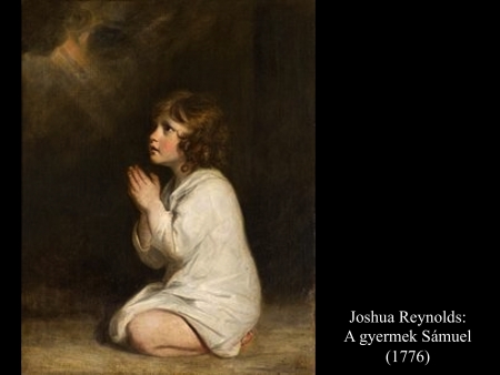 A kis Sámuel Éli felügyeletével szolgálta az Urat. Abban az időben az Úr ritkán hallatta szavát; jelenést sem lehetett gyakran látni. Az egyik nap mégis történt, hogy Éli a szokott helyén aludt. A szeme már kezdett gyengülni, nem sokat látott. Isten lámpája még nem aludt ki. Sámuel az Úr templomában aludt, ahol az Isten ládája állt. Az Úr megszólította: „Sámuel, Sámuel!” „Itt vagyok” – felelte. Azután odafutott Élihez, és azt mondta: „Itt vagyok, hívtál.” Az ezt válaszolta: „Nem hívtalak, feküdj le és aludj.” Elment és lefeküdt aludni. Az Úr azonban újra szólította: „Sámuel!” És Sámuel fölkelt, odament Élihez és azt mondta: „Itt vagyok, hívtál.” Ez azt felelte: „Nem hívtalak, fiam, feküdj le és aludj!” Sámuel ugyanis még nem ismerte az Urat, még nem volt része abban, hogy az Úr megnyilatkozzék neki. Az Úr most újra szólította Sámuelt, harmadszorra. Fölkelt, odament Élihez és így szólt: „Itt vagyok, hívtál.” Erre Éli megértette, hogy az Úr szólította a fiút. Ezért azt mondta Éli Sámuelnek: „Menj, feküdj le és aludj, aztán ha valaki szólít, így válaszolj: Beszélj, Uram, szolgád figyel!” Sámuel elment és nyugovóra tért a helyén. Akkor megjelent az Úr, elé állt és szólította, mint előző alkalommal: „Sámuel, Sámuel!” És Sámuel így válaszolt: „Beszélj, szolgád figyel!” Akkor az Úr azt mondta Sámuelnek: „Nézd, olyat teszek Izraelben, hogy aki csak hallja, annak mindkét füle csengeni fog tőle. Azon a napon valóra váltom Élin mind, amit házára kimondtam, elejétől végig. Neked kell hírül adnod neki, hogy minden időre kimondtam házára az ítéletet, mert tudta, hogy fiai káromolták Istent, mégsem tiltotta meg nekik. Azért megesküdtem Éli házának: Éli házának bűnéért sem véres áldozat, sem ételáldozat nem engesztel ki soha.” (1 Sám 3,1-14) Joshua Reynolds (1770-1776) képein a gyermek Sámuel Isten megnyilatkozását fogadja.