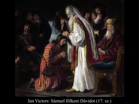 Aztán megtisztította Izájt és fiait, és meghívta őket az áldozatra. Amikor megérkeztek, s meglátta Eliabot, azt gondolta: „Nos, itt áll fölkentje az Úr előtt.” Az Úr azonban ezt mondta Sámuelnek: „Ne a külsejét és magas termetét nézd, mert hisz elvetettem. Isten ugyanis nem azt nézi, amit az ember. Az ember a külsőt nézi, az Úr azonban a szívet.” Akkor Izáj odaszólította Abinadabot, és Sámuel elé állította. De ő azt mondta: „Nem őt választotta ki az Úr.” Most Izáj Sammát állította elé, de megint azt mondta: „Nem őt választotta ki az Úr.” Izáj így bemutatta Sámuelnek hét fiát, de Sámuel így szólt Izájhoz: „Ezeket nem választotta ki az Úr.” Aztán Sámuel megkérdezte Izájt: „Mind itt vannak a fiaid?” „A legkisebb nincs itt – válaszolta –, a nyájat őrzi.” Sámuel erre meghagyta Izájnak: „Küldj el valakit, keresse meg, mert addig nem ülünk hozzá az áldozati lakomához, amíg itt nincs.” Izáj elküldött érte. Vörös volt, nyílt tekintetű és szép termetű. Az Úr így szólt: „Rajta, kend föl, mert ő az!” Erre fogta az olajosszarut és fölkente testvérei körében. Attól a naptól eltöltötte Dávidot az Úr lelke, Sámuel meg útra kelt és elment Rámába. (1 Sám 16,5-13)