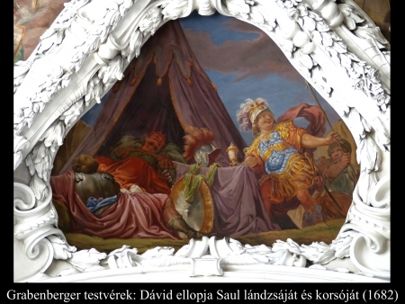 Sault alva találták a táborban – a lándzsája a fejénél a földbe szúrva. Abner és a csapat körülötte aludt. Erre Abisáj azt mondta Dávidnak: „Ma az Isten kezedbe adta ellenségedet. A saját lándzsájával odaszögezem a földhöz, egyetlen döféssel, másodikra már nem lesz szükség.” Dávid azonban így felelt Abisájnak: „Ne öld meg, mert ki maradt büntetlen, aki az Úr fölkentjére emelte kezét?!” Aztán így folytatta Dávid: „Amint igaz, hogy az Úr él: vagy az Úr öli meg, vagy elérkezik halála napja, vagy pedig csatába száll és ott pusztul. Az Úr óvjon attól, hogy kezet emeljek az Úr fölkentjére! Fogd a lándzsát, amely a király fejénél van, meg a vizeskorsót és menjünk!” Ezzel Dávid fogta Saul feje mellől a lándzsát meg a vizeskorsót, és elosontak anélkül, hogy valaki látta vagy észrevette, vagy pedig fölébredt volna. (- A Grabenberger testvérek (1682) falképén ez a pillanat látható. -) Mindnyájan aludtak, mert az Úr mély álmot bocsátott rájuk. Amikor Dávid a szemközti oldalra ért, valamivel távolabb kiállt a hegycsúcsra, úgyhogy egy széles sáv volt köztük. S Dávid odakiáltotta a seregnek és Ner fiának, Abnernek: „Nem felelsz, Abner?” „Ki vagy, aki szólítasz?” – kérdezte Abner. Dávid így válaszolt: „Hát férfi vagy? Ki fogható hozzád Izraelben? Miért nem ügyeltél uradra, a királyra? Valaki odament a seregből, hogy megölje uradat, a királyt. Nem volt szép, amit tettél. Amint igaz, hogy az Úr él: halált érdemeltek, amiért nem vigyáztatok uratokra, az Úr fölkentjére. Nézd csak meg, hol van a király lándzsája, és hol a vizeskorsó, amely a fejénél állt.” Saul megismerte Dávid hangját, és odaszólt: „Nem a te hangod az, fiam, Dávid?” „De igen, uram, és királyom!” – válaszolta Dávid. Aztán így folytatta: „Miért üldözi uram szolgáját? Mit vétettem? Milyen igazságtalanság tapad a kezemhez? Vessen ügyet uram és királyom a szavaimra! Ha az Úr bújtott fel ellenem, akkor szálljon felé áldozat illata. Ha azonban emberek voltak, legyenek átkozottak az Úr színe előtt. Mert elűznek, hogy ne legyen örökrészem az Úr földjén, hiszen azt mondják: Menj innét, szolgálj más isteneknek! De nem, vérem nem omlik az Úrtól távol a földre. Még akkor sem, ha Izrael királya kivonult, hogy hajszolja életemet, amint a hegyek közt a foglyot szokás üldözni.” Erre Saul azt mondta: „Vétkeztem. Igazságtalan voltam. Térj vissza, fiam, Dávid! Többé nem teszek neked rosszat, mivel ma kedves volt szemedben az életem. Igen, esztelen voltam és nagyot tévedtem.” Dávid így felelt: „Lám, itt a király lándzsája. Jöjjön át valamelyik szolgád, és vigye el. Az Úr mindenkinek megfizet igazságosságában és hűségében. Az Úr ma kezembe adott, de nem akartam kezet emelni az Úr fölkentjére. Amilyen kedves volt az életed a szememben, legyen az én életem is olyan kedves az Úr szemében. Szabadítson ki minden szorongatottságból!” Saul erre azt mondta Dávidnak: „Légy áldott, fiam, Dávid! Minden bizonnyal szerencsés leszel és eléred célodat.” Dávid ment az útján, Saul meg hazatért. (1 Sám 26,1-25)