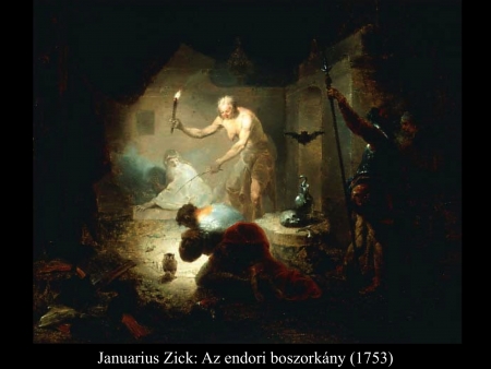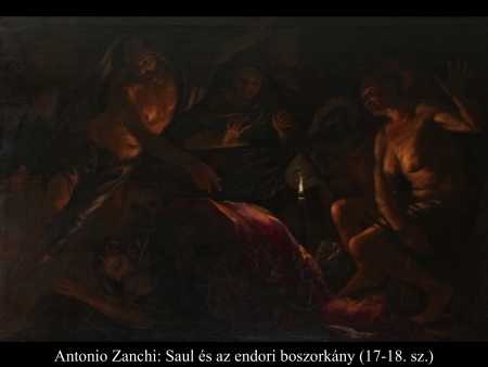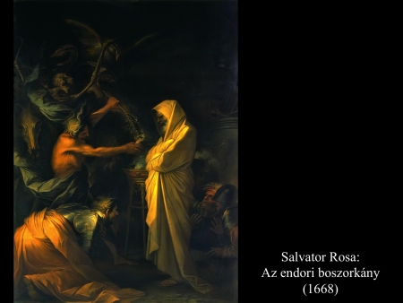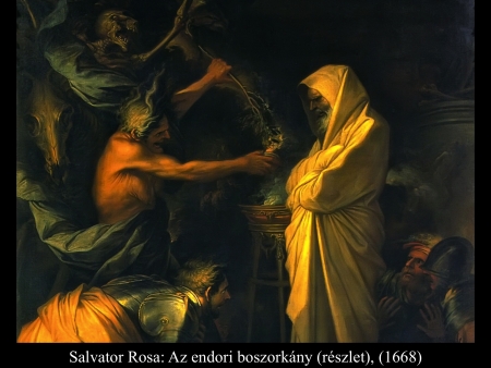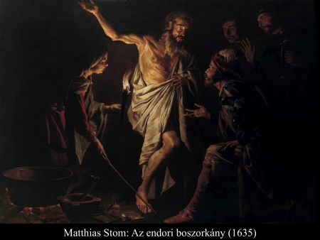 Sámuel meghalt, és egész Izrael elsiratta. Városában, Rámában temették el. A halottidézőket és a jövendőmondókat meg kiűzte Saul az országból. Mikor a filiszteusok egybegyűltek, elindultak és Sunem közelében ütöttek tábort. Saul összehívta egész Izraelt, és a Gilboa környékén táboroztak. A filiszteusok táborának láttán félelem fogta el Sault, csak úgy remegett a szíve. Ezért Saul megkérdezte az Urat, de az Úr nem adott neki feleletet sem álmában, sem jelekkel, sem pedig a próféták által. Ezért Saul megparancsolta szolgáinak: „Kerítsetek nekem egy asszonyt, aki ért a halottidézéshez! Elmegyek és kérdést intézek hozzá.” Szolgái azt felelték: „En-Dorban van egy halottlátó asszony.” Erre Saul álarcot öltött, más ruhába öltözött, és két emberével elment hozzá. Éjszaka értek oda az asszonyhoz. Így szólt hozzá: „Mondd meg nekem a jövendőt, halottat idézve, de azt idézd meg, akit megnevezek.” Az asszony ezt válaszolta neki: „Magad is tudod, mit tett Saul: mind kiirtotta az országból a halottidézőket és a jövendőmondókat. Miért állítasz hát csapdát nekem? Azért, hogy elvedd az életemet?” Erre Saul megesküdött neki az Úrra. Azt mondta: „Amint igaz, hogy az Úr él: ezzel nem vonsz magadra bűnt.” Így hát az asszony megkérdezte: „Kit idézzek meg neked?” „Sámuelt idézd meg” – felelte. És az asszony látta Sámuelt és hangosan felkiáltott. Aztán így szólt az asszony Saulhoz: „Miért vezettél félre? Hiszen Saul vagy!” A király azt válaszolta neki: „Ne félj! Mit látsz?” „Egy szellemet látok, amint fölfelé száll a földről” – mondta az asszony. Saul megkérdezte: „Milyennek látod?” Az asszony így felelt: „Egy öregember száll fölfelé, köntösébe burkolózva.” Ebből Saul megtudta, hogy Sámuel. A földig hajolt és leborult előtte. Sámuel így szólt Saulhoz: „Miért zavarsz nyugalmamban, s miért idéztél meg?” „Nagy szorultságban vagyok – válaszolta Saul –, mert a filiszteusok hadat indítottak ellenem, és az Úr elfordult tőlem: nem ad nekem feleletet sem a próféták által, sem álmomban. Ezért idéztelek meg. Mondd meg nekem, mit tegyek.” „Miért kérdezel – felelte Sámuel –, amikor az Úr elfordult tőled és ellenséged lett? Azt tette veled az Úr, amit általam előre megmondott neked. Az Úr kiragadja kezedből a királyságot és rokonodnak, Dávidnak adja, mert nem hallgattál az Úr szavára, és izzó haragját nem töltötted ki Amaleken – ezért tette ma veled ezt az Úr. Az Úr veled együtt Izraelt is a filiszteusok kezére adja. Holnap fiaiddal egyetemben velem leszel, s az Úr Izrael táborát is a filiszteusok kezébe adja.” Saul erre egész hosszában elterült a földön, mert Sámuel szavai miatt nagy félelem kerítette hatalmába. Semmi erő nem volt benne, hiszen egész nap és egész éjjel nem evett semmit. Amikor az asszony odalépett Saulhoz, és látta, hogy teljesen elerőtlenedett, így szólt hozzá: „Nézd, szolgálód csak parancsodnak engedett. Kockára tettem életemet és teljesítettem kívánságodat, amellyel hozzám fordultál. Most hát hallgass szolgálód szavára. Hadd adjak neked egy darab kenyeret. Edd meg, hogy erőre kapj és elmehess utadra.” De visszautasította: „Nem eszem” – felelte. Hanem amikor szolgái az asszonnyal együtt unszolták, engedett szavuknak: fölállt a földről és leült. Az asszonynak volt egy hizlalt borja a háznál. Gyorsan levágta, aztán fogta a lisztet, bedagasztotta, és kovász nélkül lepényt sütött belőle. Aztán Saul és szolgái elé tette. Miután ettek, fölálltak és még azon éjszaka visszatértek. (1 Sám 28,3-25)