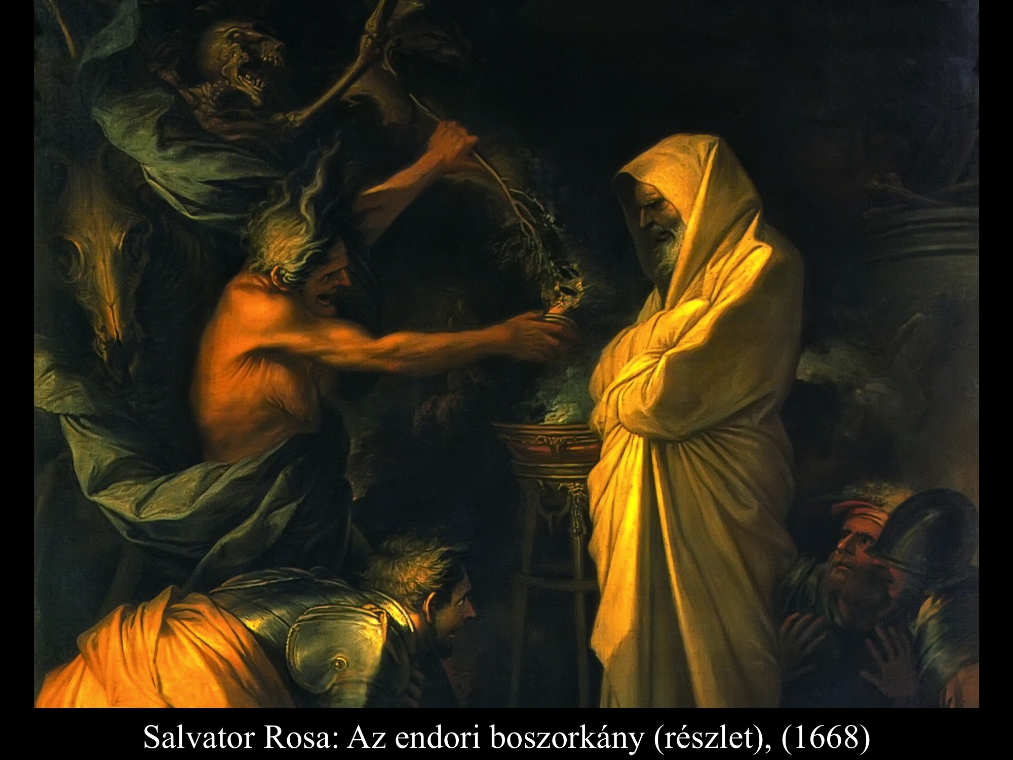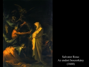 Salvator Rosa (1668) endori boszorkánya varázsfőzetet készít, úgy idézi meg a fehér lepelbe öltözött Sámuel szellemét. A halál csontvázként ábrázolt démona lovon érkezik, felette madár repül. Januarius Zick (1753) festményén Sámuel szelleme mintha sírból kelne ki. A halottidéző asszony asztalán koponya, üvegből kitekeredő kígyó, felette denevér, Saulhoz közel pedig egy bagoly fedezhető fel. Az asszony félmeztelen Antonio Zanchi (17-18. sz.) képén is, ahol Sámuel a levegőben száll, Saul pedig arccal földig borul félelmében. Matthias Stom (1635) és Bernardo Cavallino (1655) képei realisztikusabban mutatják be a jelenetet.