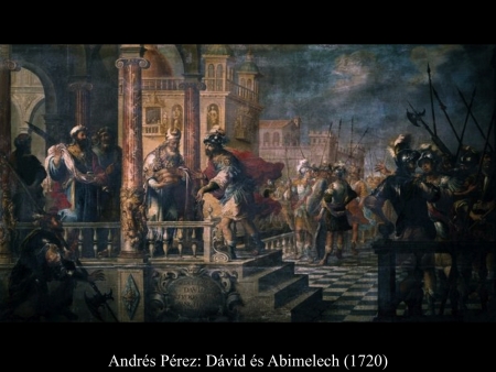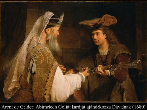 Andrés Pérez (1720) képén Abimelech megszentelt kenyereket ad át Dávidnak, mögötte egy másik férfi Góliát kardját hozza. Arent de Gelder (1680) gyönyörű festményén Dávid Góliát kardját veszi át a paptól.