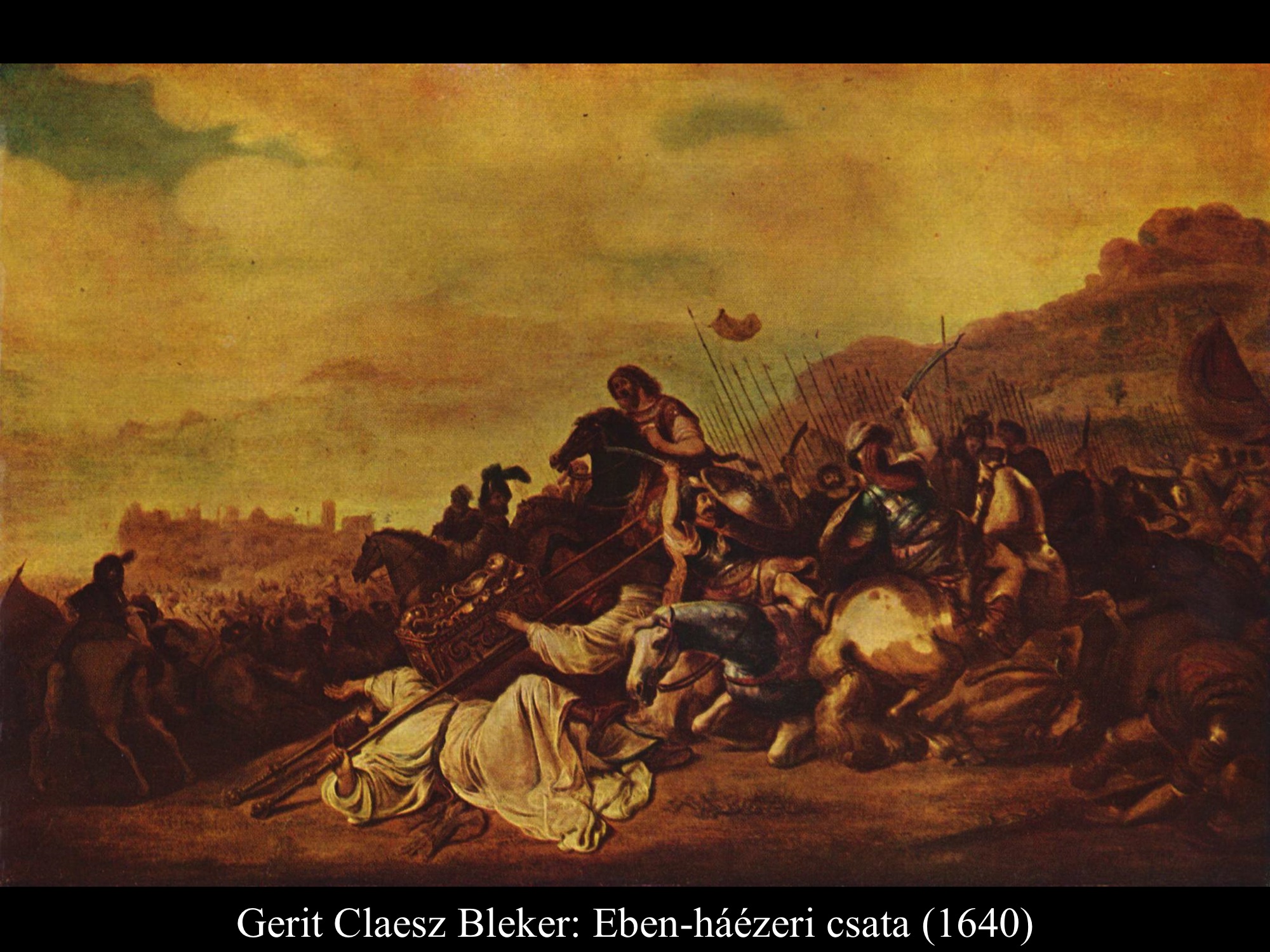 A filiszteusok hallották az örömujjongást, és megkérdezték: „Mit jelent a héberek táborában ez a hangos ujjongás?” Amikor megtudták, hogy az Úr ládája a táborba érkezett, a filiszteusokat félelem fogta el, mert azt mondták: „Istenük eljött hozzájuk a táborba.” És így beszéltek: „Jaj nekünk, hisz ilyen még nem fordult elő! Jaj nekünk! Ki szabadít ki minket ennek a hatalmas Istennek a kezéből? Ez az az Isten, aki az egyiptomiakat mindenféle csapással sújtotta a pusztában. Szedjétek hát össze minden erőtöket, és legyetek férfiak, filiszteusok, nehogy a héberek szolgaságába kerüljetek, amint ők voltak a ti szolgaságotokban. Bizonyuljatok férfinak és harcoljatok!” A filiszteusok küzdöttek, és Izrael fiai vereséget szenvedtek. Menekültek, ki-ki a maga városába. Vereségük nagyon súlyos volt: Izrael fiai közül harmincezer gyalogos elesett. Az Isten ládáját is zsákmányul ejtették, és Élinek mindkét fia meghalt, Hofni is, Pinchász is. (1 Sám 4,6-11) Gerit Claesz Bleker (1640) képén Hofnit és Pinchász, Éli két fia is látható, amint összerogynak az őket megrohamozó filiszteusok támadása során.