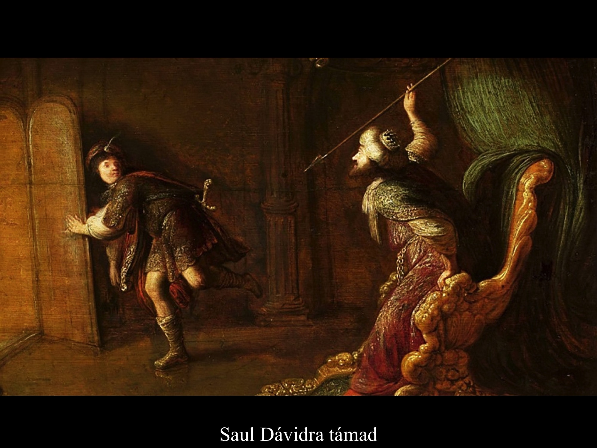 Rembrandt (1670) jól érzékelteti Saul tébolyultságát, ahogy fél szemét a függönnyel takarja, gondolatai pedig egyre jobban kínozzák. Másik festményén már a dárdát markolja, tekintete rossz szándékáról árulkodik. Aert de Gelder (1682) képén magába mélyedve tanakodik. Pillanatok múlva Dávid a célpontjává válik.