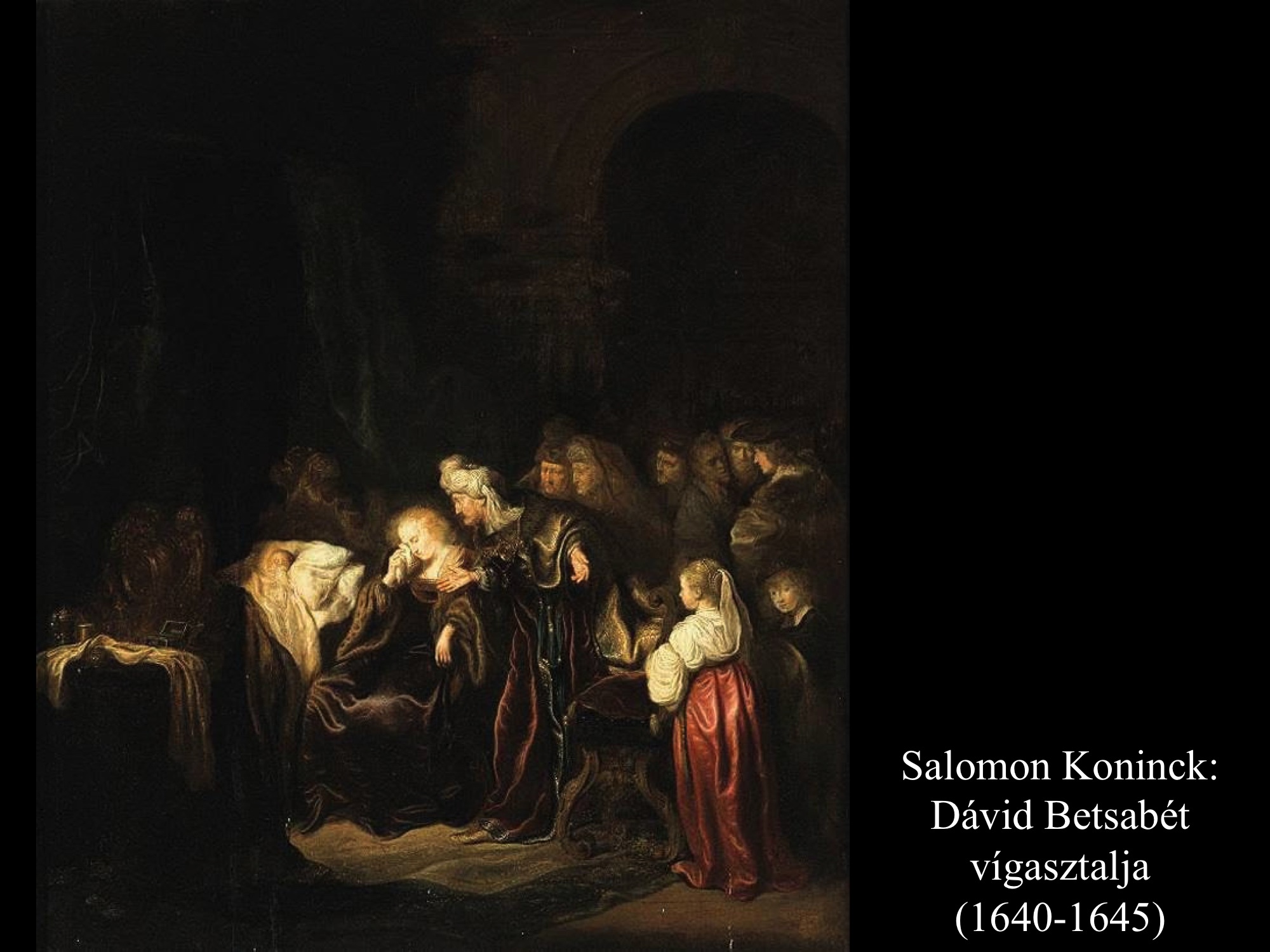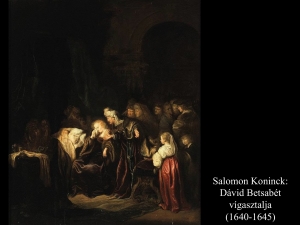Salomon Koninck (1640-45) képén a halott gyermekét sirató Betsabé látható, akit Dávid vígasztal. Jacob Adriaensz Backer (1740) festményén Dávid terített asztal mellett ül, ami szintén arra utal, hogy a gyermek már meghalt, hiszen míg élt, szigorú böjtöt tartott a király. Szomorúan tekint maga elé, miközben Betsabé a nyakába borulva sír. A kép gyönyörű intimitása a kézfogásban rejlik. Ebből a "kézfogásból" fogan meg az újabb gyermek, Salamon.