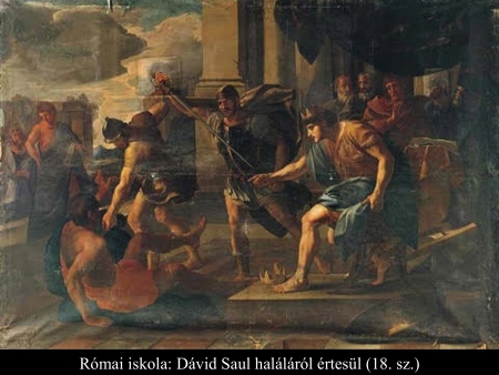 Ez a kegyelemdöfés látható a római iskola festőjének (18. sz.) képén. Dávid ezután siratóénekkel emlékezett meg Saulról és Jonatánról, akiket a gileádi Jábes lakói temettek el.