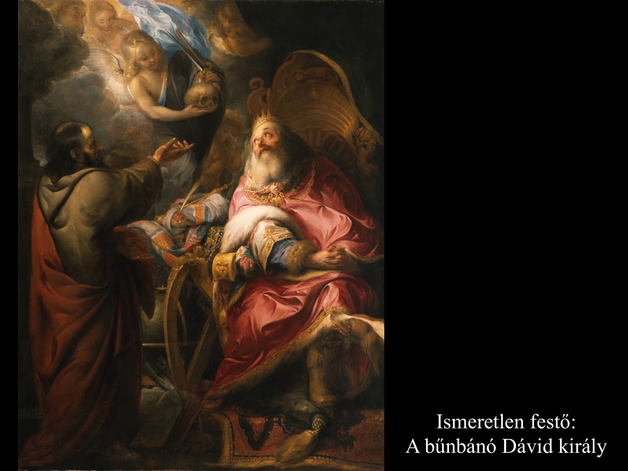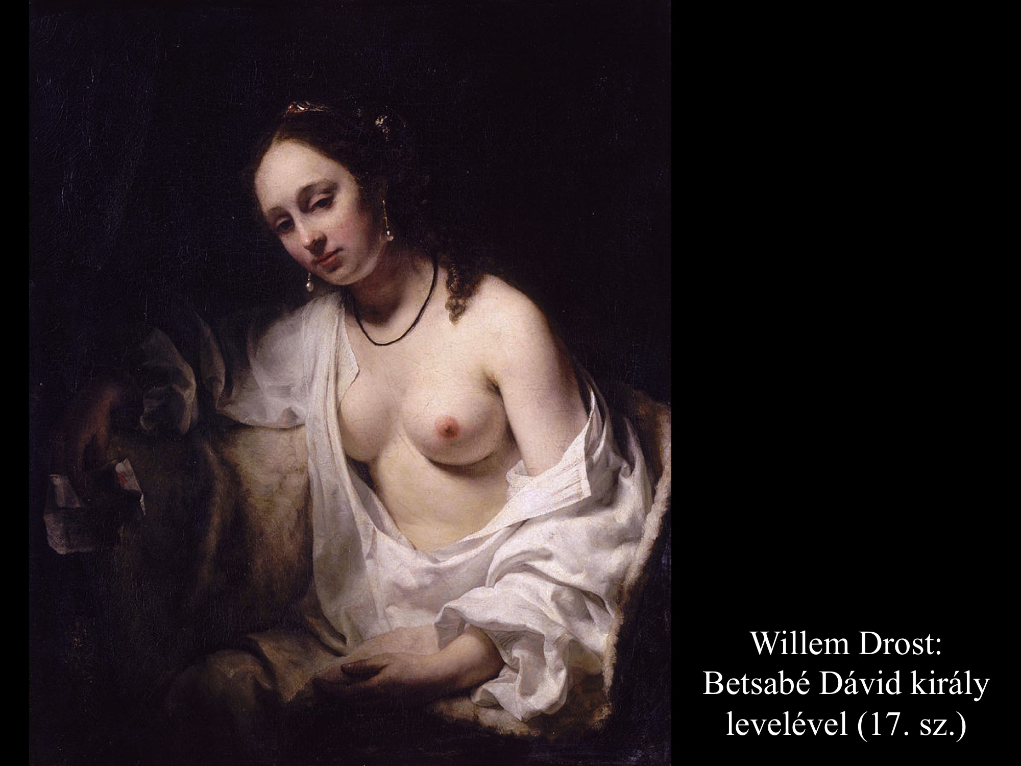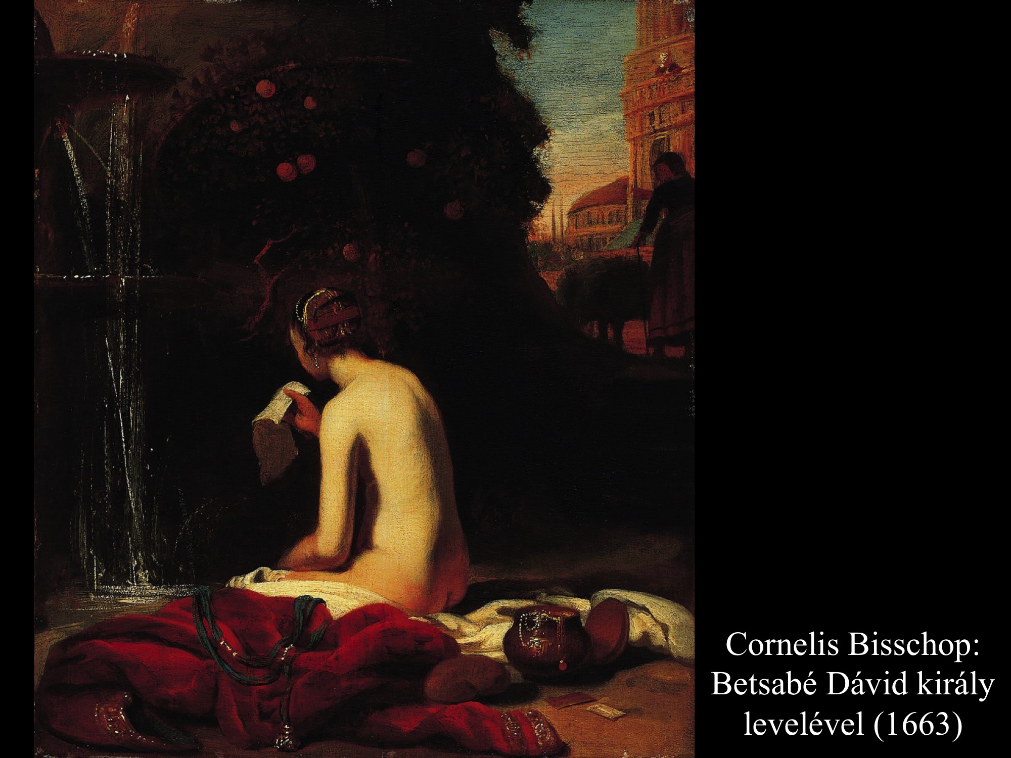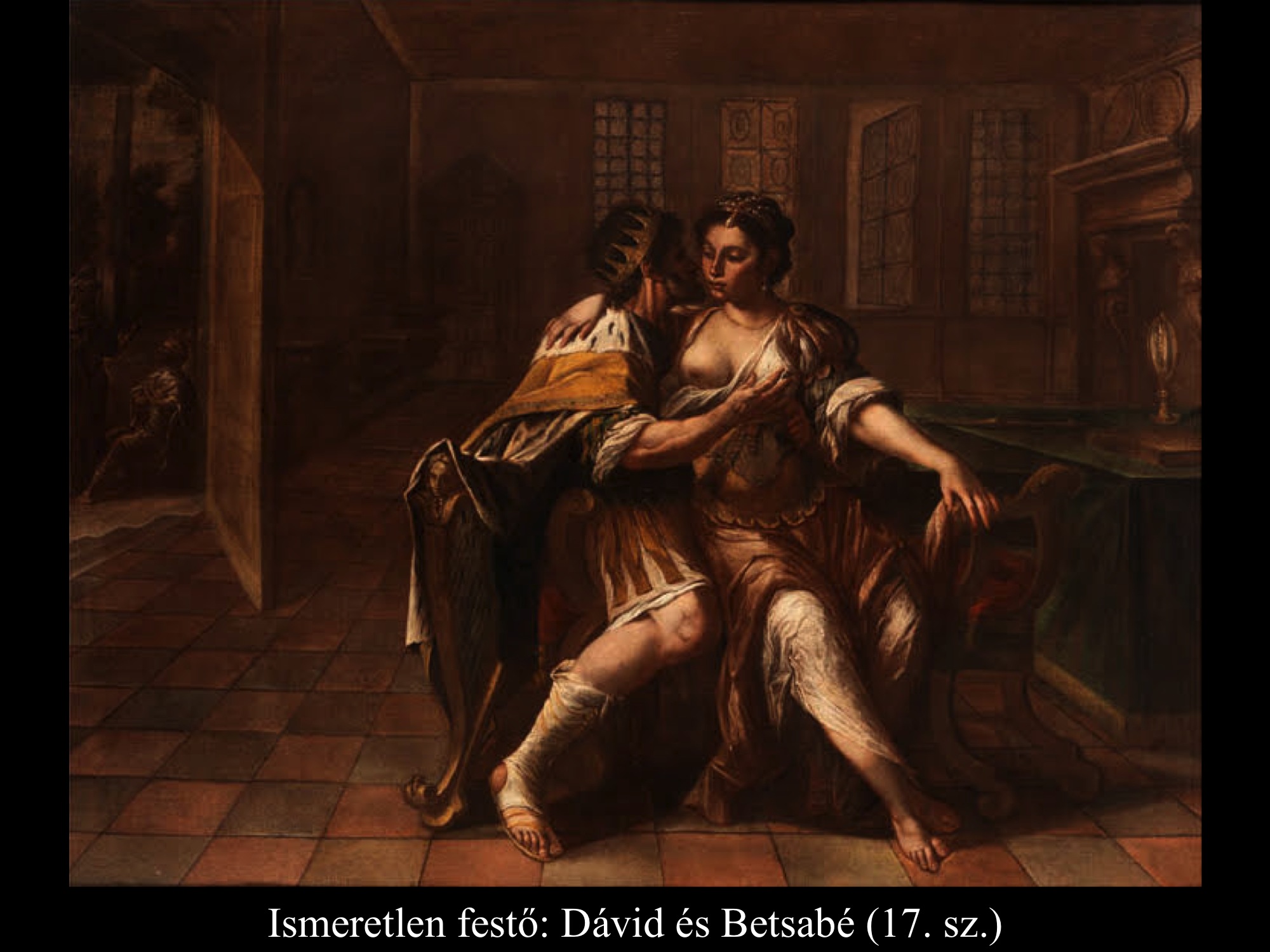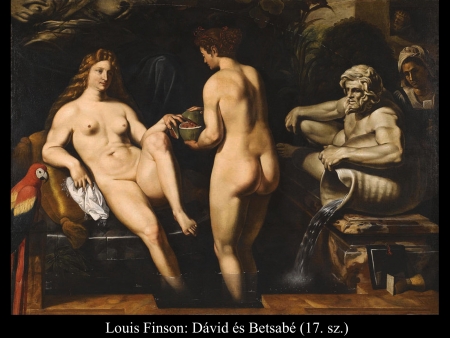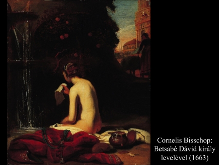 A következményekből derül csak ki, hogy nem csupán érzéki fellángolás volt ez a király részéről, máskülönben eltaszította volna magától az asszonyt, mikor megtudta, hogy várandós. Mivel megszerette, inkább vett a lelkére újabb bűnt, minthogy cserbenhagyta volna. A bűn azonban nem marad következmények nélkül, ez a mondanivalója az ismeretlen művész (17. sz.) által festett képnek is. Az intim jelenet hátterében, a nyitott ajtó mögött Nátán próféta alakja tűnik fel, aki majdan figyelmezteti Dávidot, hogy gonoszat tett az Úr szemében.