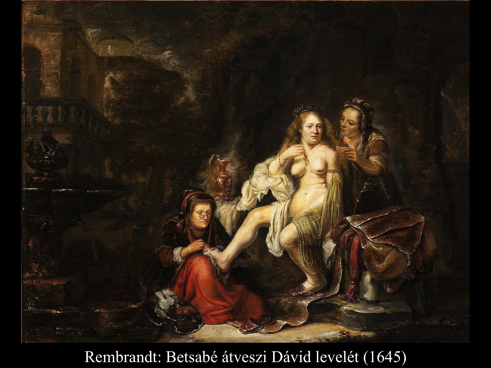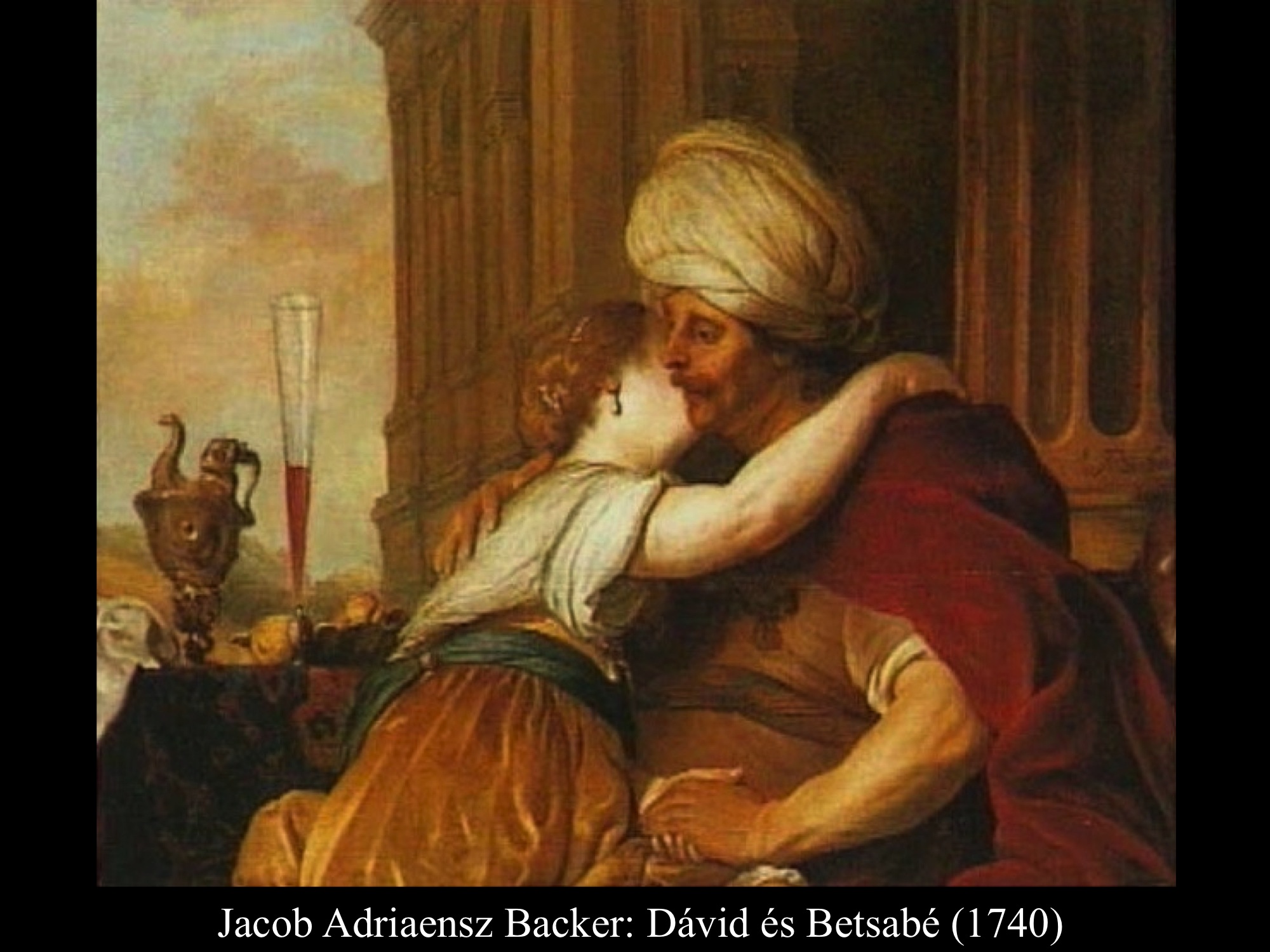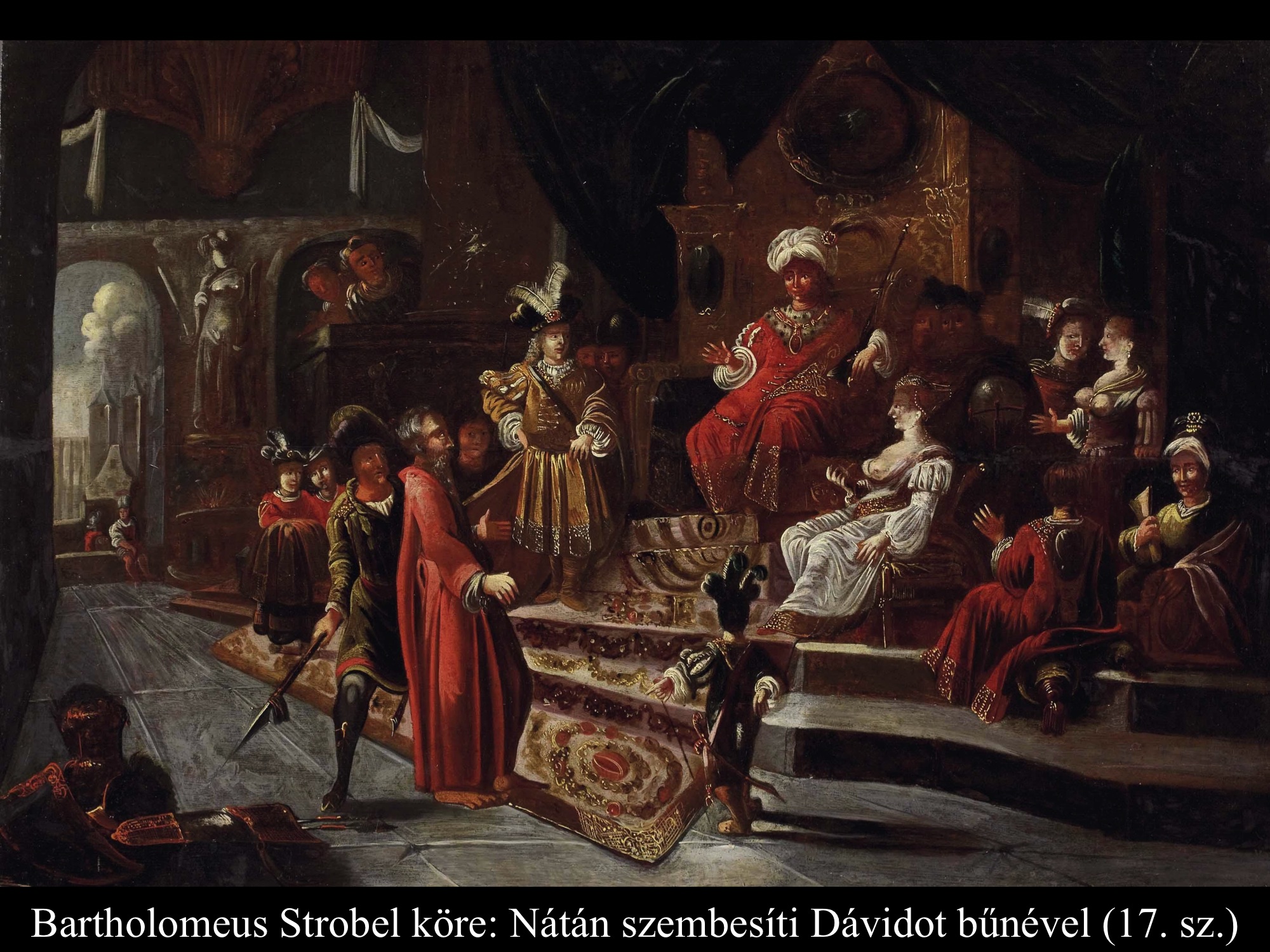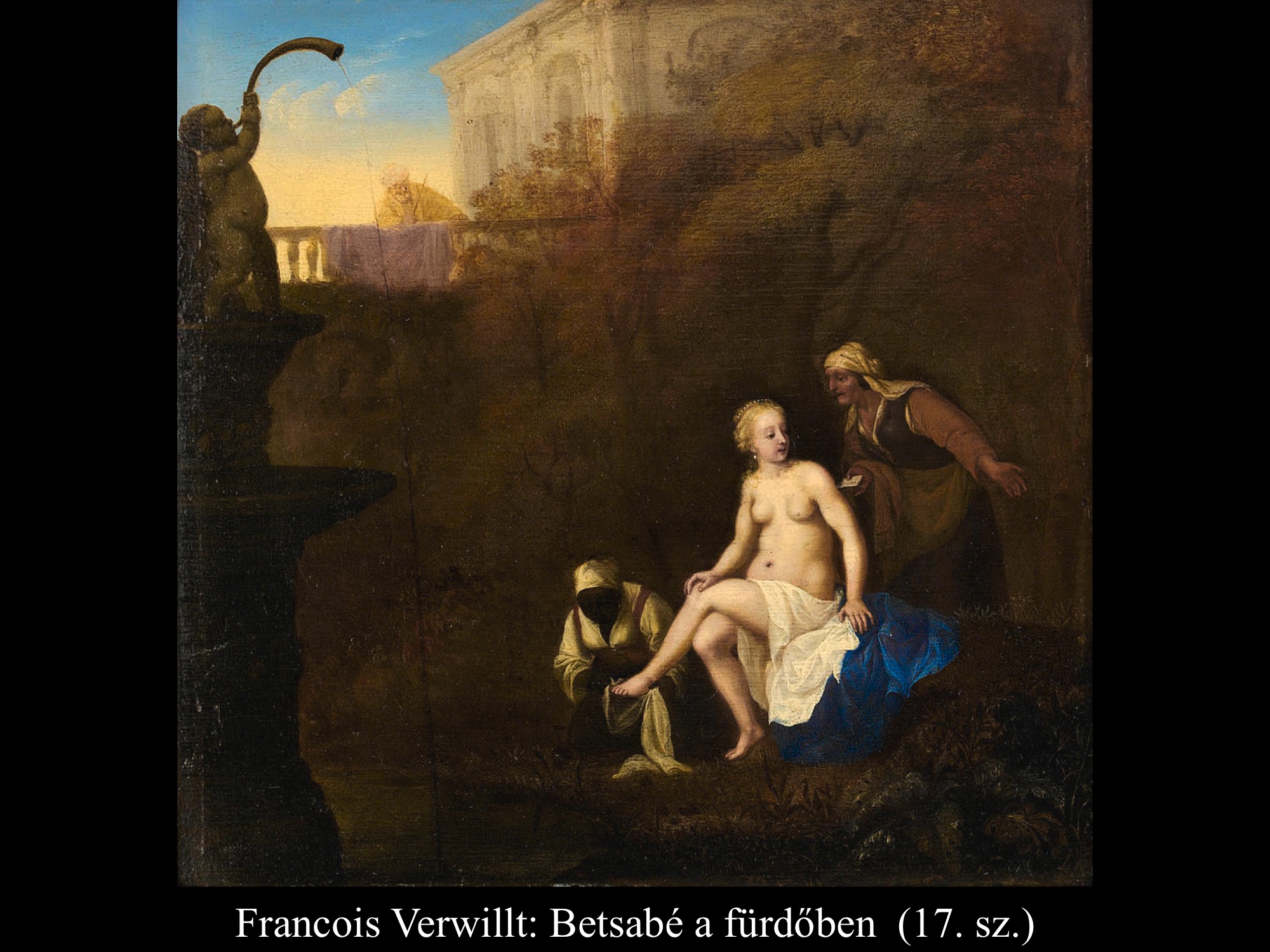 A következményekből derül csak ki, hogy nem csupán érzéki fellángolás volt ez a király részéről, máskülönben eltaszította volna magától az asszonyt, mikor megtudta, hogy várandós. Mivel megszerette, inkább vett a lelkére újabb bűnt, minthogy cserbenhagyta volna. A bűn azonban nem marad következmények nélkül, ez a mondanivalója az ismeretlen művész (17. sz.) által festett képnek is. Az intim jelenet hátterében, a nyitott ajtó mögött Nátán próféta alakja tűnik fel, aki majdan figyelmezteti Dávidot, hogy gonoszat tett az Úr szemében.