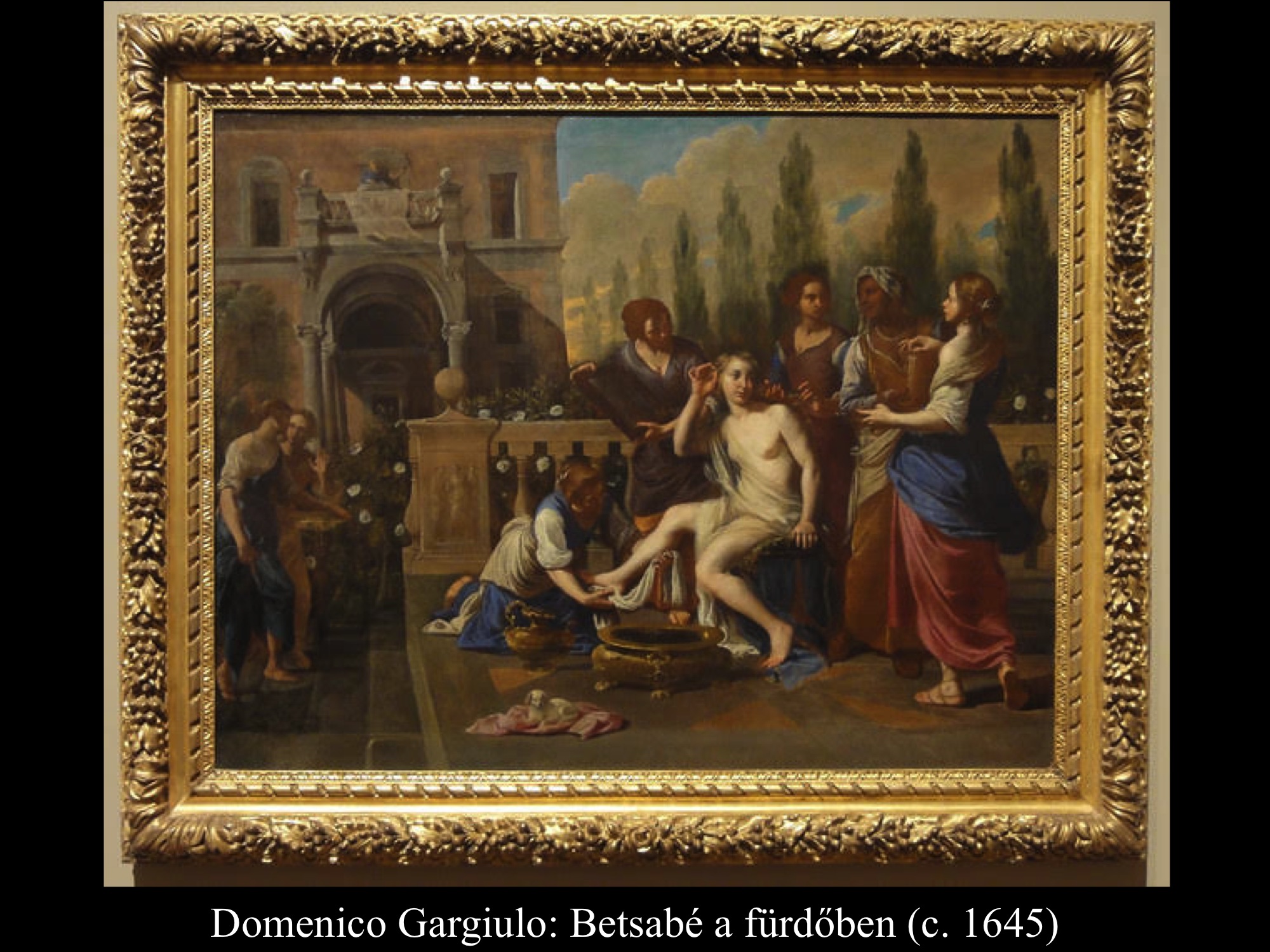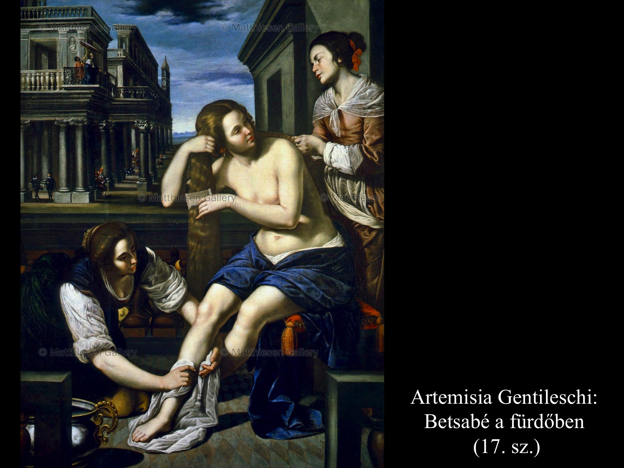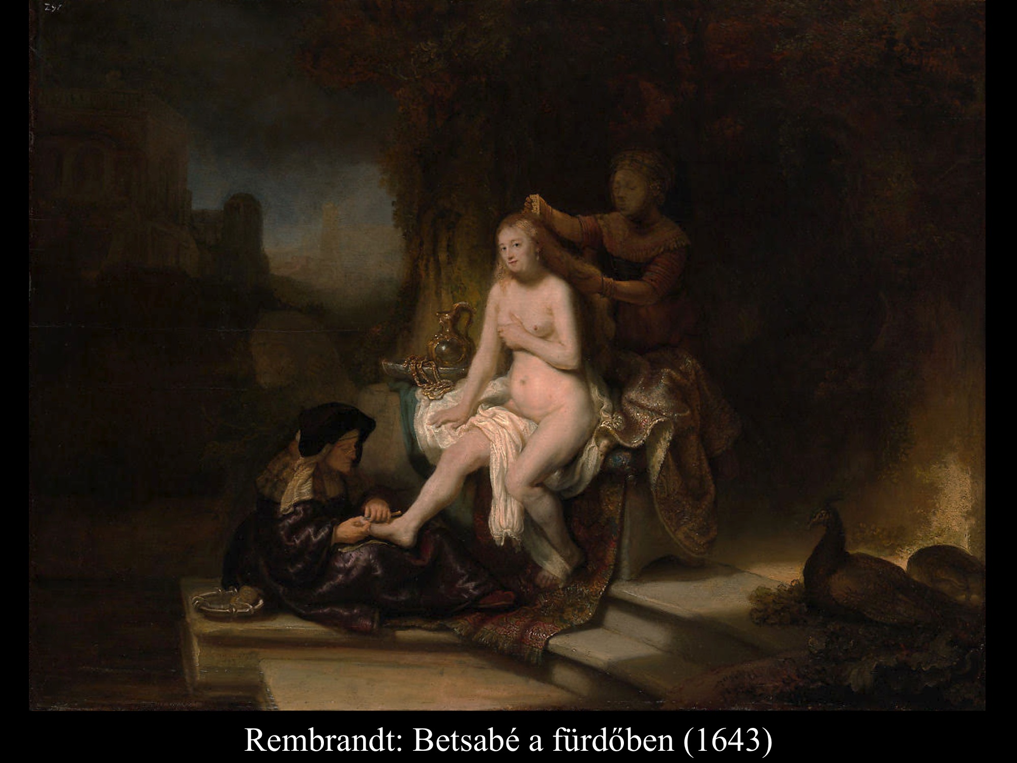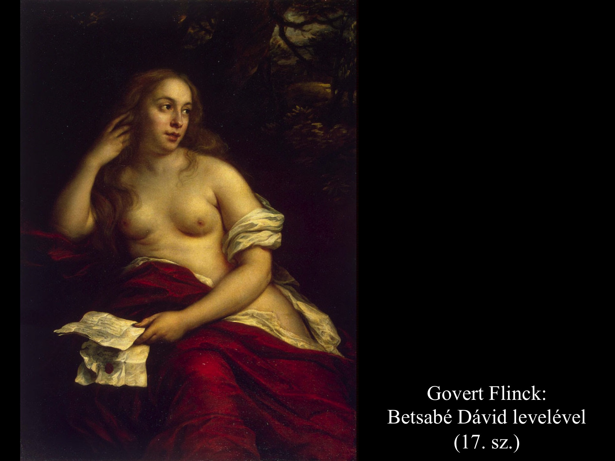 A következményekből derül csak ki, hogy nem csupán érzéki fellángolás volt ez a király részéről, máskülönben eltaszította volna magától az asszonyt, mikor megtudta, hogy várandós. Mivel megszerette, inkább vett a lelkére újabb bűnt, minthogy cserbenhagyta volna. A bűn azonban nem marad következmények nélkül, ez a mondanivalója az ismeretlen művész (17. sz.) által festett képnek is. Az intim jelenet hátterében, a nyitott ajtó mögött Nátán próféta alakja tűnik fel, aki majdan figyelmezteti Dávidot, hogy gonoszat tett az Úr szemében.