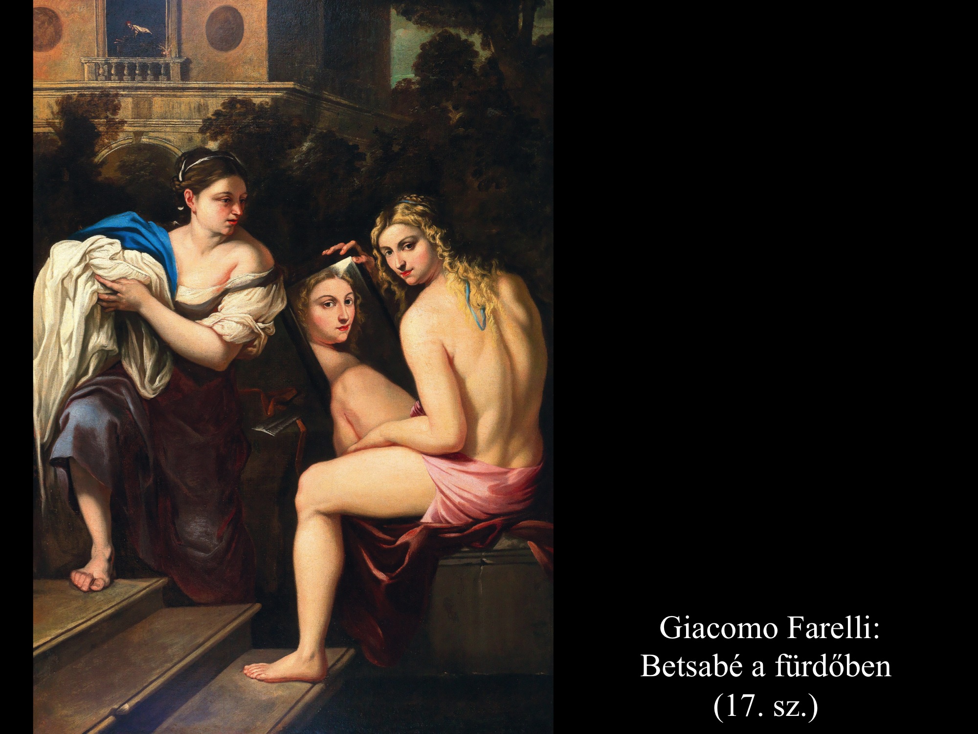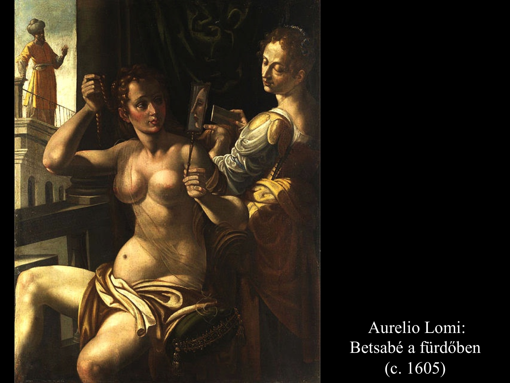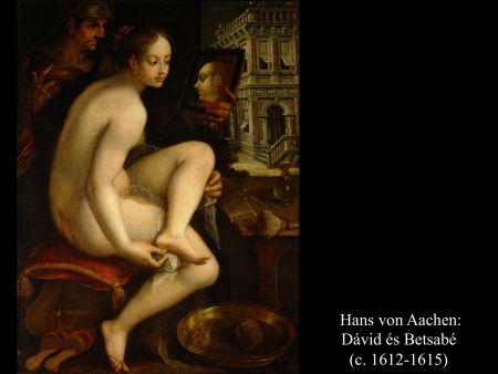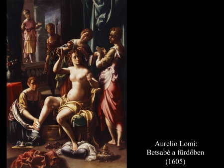 Aurelio Lomi (c. 1605) korabarokk festményére tekintve meg kell említeni Betsabé héber eredetű nevének jelentését, mely eredetileg "eskü lánya", de 'buja, dús, telt' jelentéssel is bír. Lomi mindkét képén enteriőrbe helyezi a szépítkező asszonyt, aki tükréből pillantja meg a közeli palotaerkélyről integető Dávidot. A tükörkép azonban nem felel meg a valóságnak, mint ahogy Hans von Aachen (c. 1612-1615) és Giacomo Farelli (17. sz.) képein sem. Feltételezhető, hogy nem tudatlanságból fakad ez az optikai lehetetlenség, hanem szándékos jelentéssel bír. A tükör is csal, hiszen Dávid házasságtörésre csábítja Urija feleségét. Ezt a feltételezést megerősíti Hans von Aachen ötletes megoldása is: Urija kezébe adja a tükröt, ő tartja felesége elé. A Szentírás szövegéből tudjuk, hogy valójában távol tartózkodott, így az ábrázolás szimbolikus. Betsabé "lelkitükörbe" néz, mivel megszólal lelkiismerete, de a tükörkép előrevetítve a végzetes jövőt.