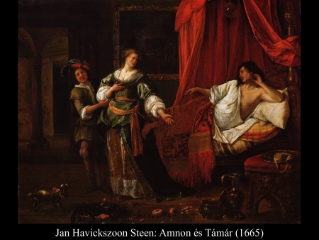 Erre Jonadab azt mondta: „Feküdj le az ágyba, és tettesd magad betegnek. Ha aztán eljön apád meglátogatni, hát mondd neki: Engedd meg, hadd jöjjön el a húgom, Támár, s ő adjon nekem enni. Ha itt készíti el az ételt a szemem láttára, akkor elfogadom a kezéből.” Amnon tehát lefeküdt az ágyba és betegnek tetette magát. Amikor a király elment meglátogatni, Amnon így szólt a királyhoz: „Engedd meg, hadd jöjjön el a húgom, Támár, s hadd csináljon a szemem láttára néhány lepényt. Az ő kezéből megenném.” Erre Dávid üzent Támárnak a palotába: „Menj el bátyád, Amnon házába, és készíts neki valami ételt.” Támár tehát elment bátyja, Amnon házába. Az ágyban feküdt. Fogta a tésztát, kidagasztotta, s a szeme láttára lepényt csinált belőle, aztán megsütötte a lepényt. Akkor fogta a serpenyőt és kiborította előtte. De ő nem akart enni, hanem azt mondta: „Menjetek ki innét, mindnyájan!” Erre mindannyian elmentek. Most azt mondta Amnon Támárnak: „Hozd be nekem az ételt a belső szobába, hogy a kezedből ehessek.” Támár fogta a lepényt, amelyet csinált, és bevitte bátyjának, Amnonnak a belső szobába. De amikor odanyújtotta neki, az elkapta őt és azt mondta neki: „Gyere, húgom, feküdj mellém!” Azt felelte neki: „Hagyd ezt, bátyám, ne becsteleníts meg! Ilyesmit nem szokás Izraelben tenni. Ne kövess el ilyen gyalázatos dolgot! Hova mehetnék szégyenemmel? S te magad is egyike vagy Izrael főembereinek. Beszélj inkább a királlyal, biztosan nem tagad meg tőled.” De nem hallgatott szavára, erőszakot követett el rajta, meggyalázta, együtt hált vele. (2Sám13,1-14)