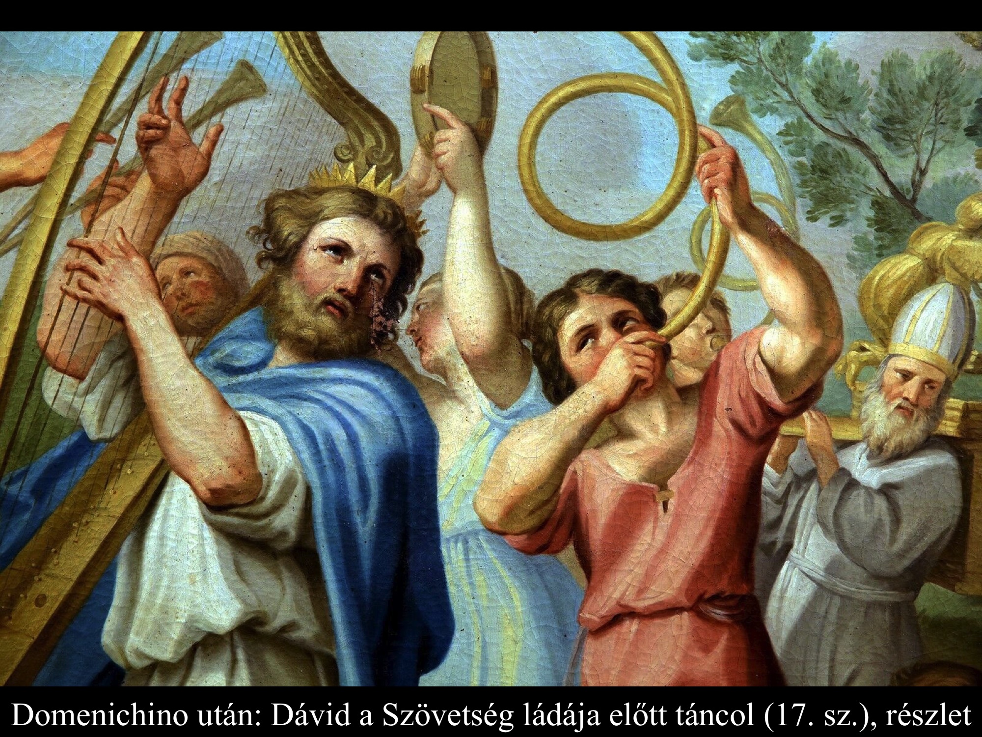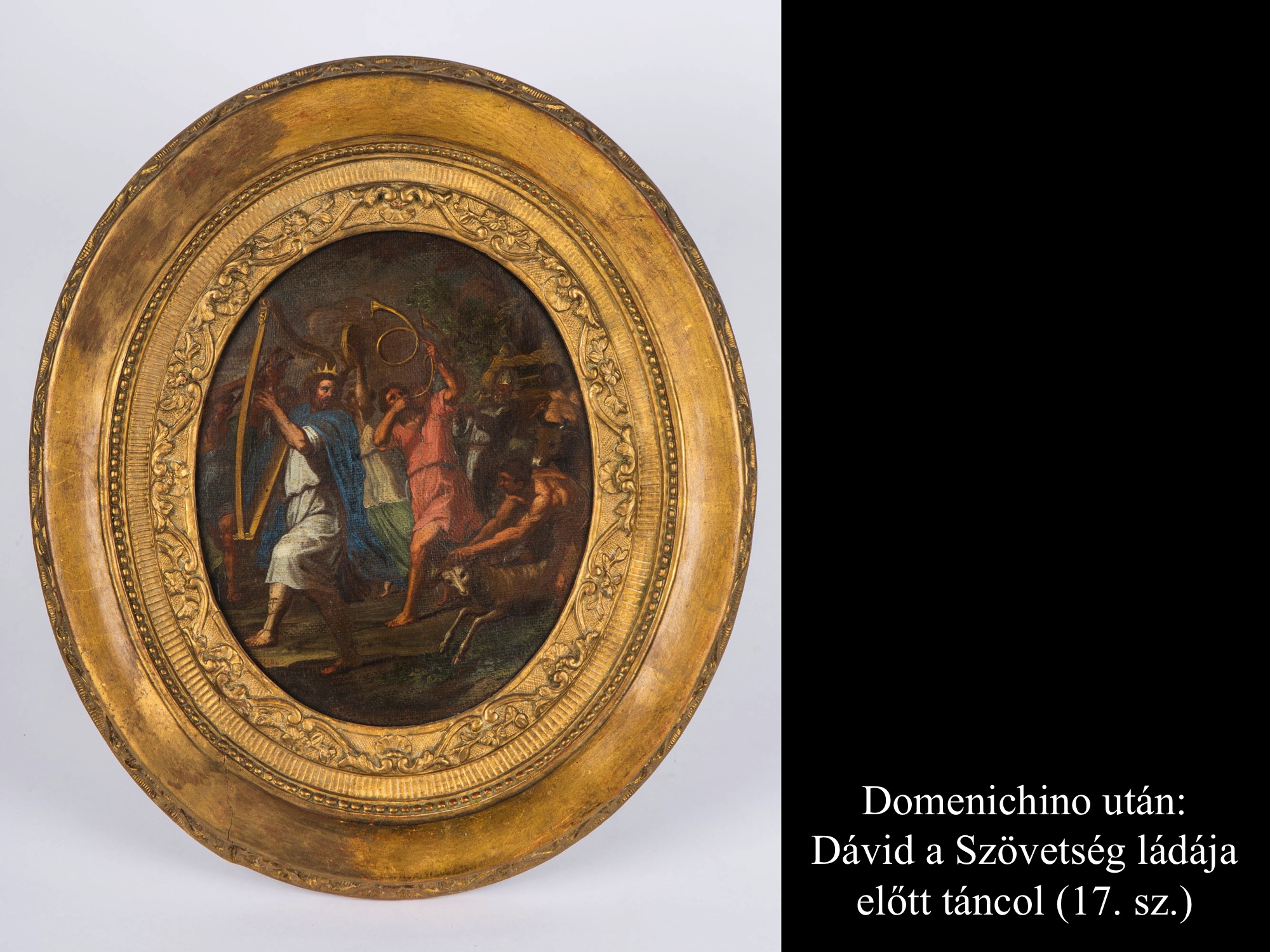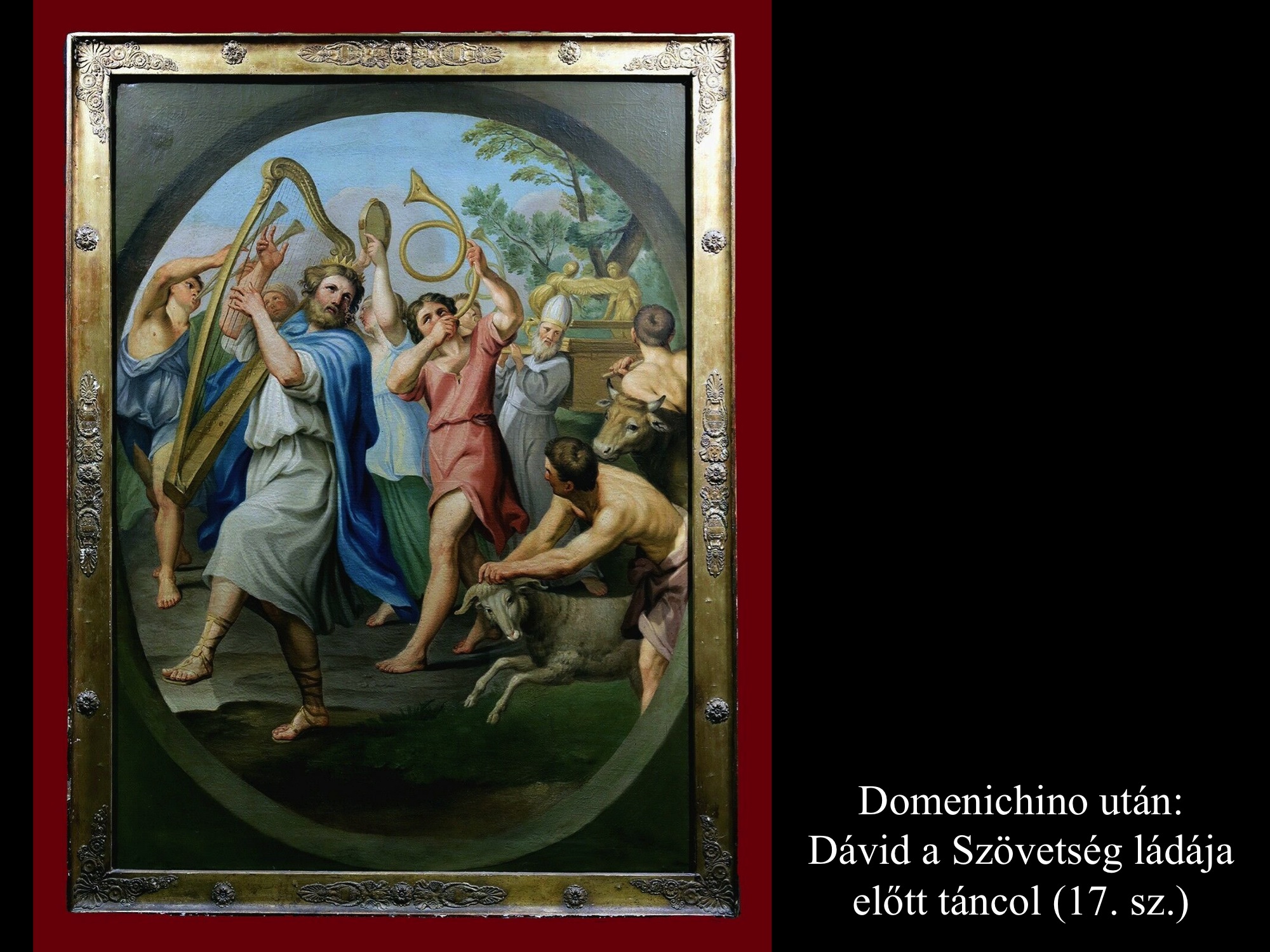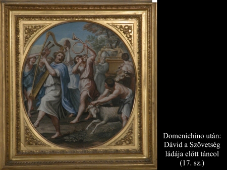 Domenichino eredeti ábrázolásáról több 17. századi másolat is fennmaradt, melyen Dávid a Szövetség ládája előtt táncolva éppen elindul Gátból Jeruzsálembe. A képeken láthatók a szövegben említett állatok is, amiket 6 lépés után áldozott fel.