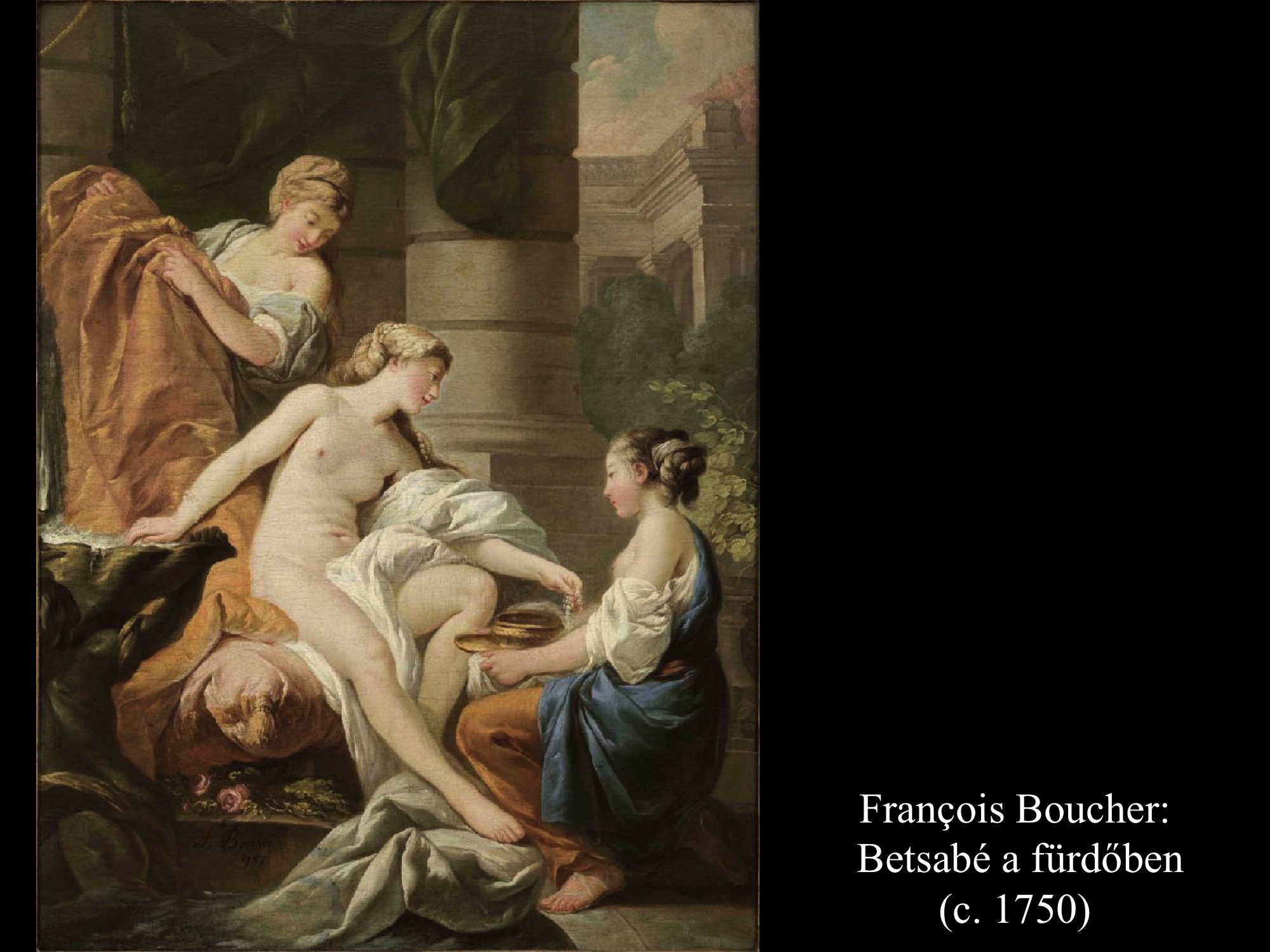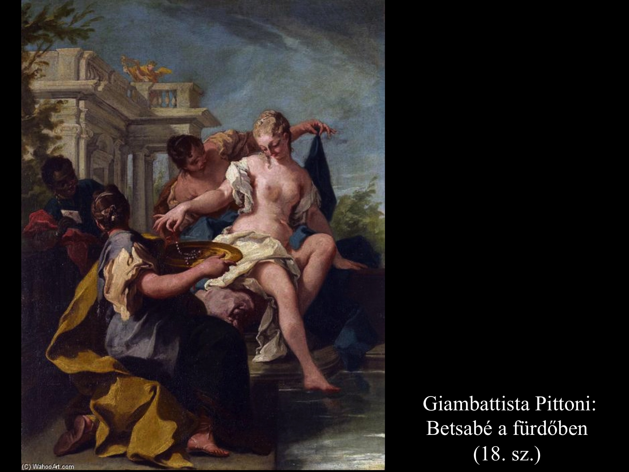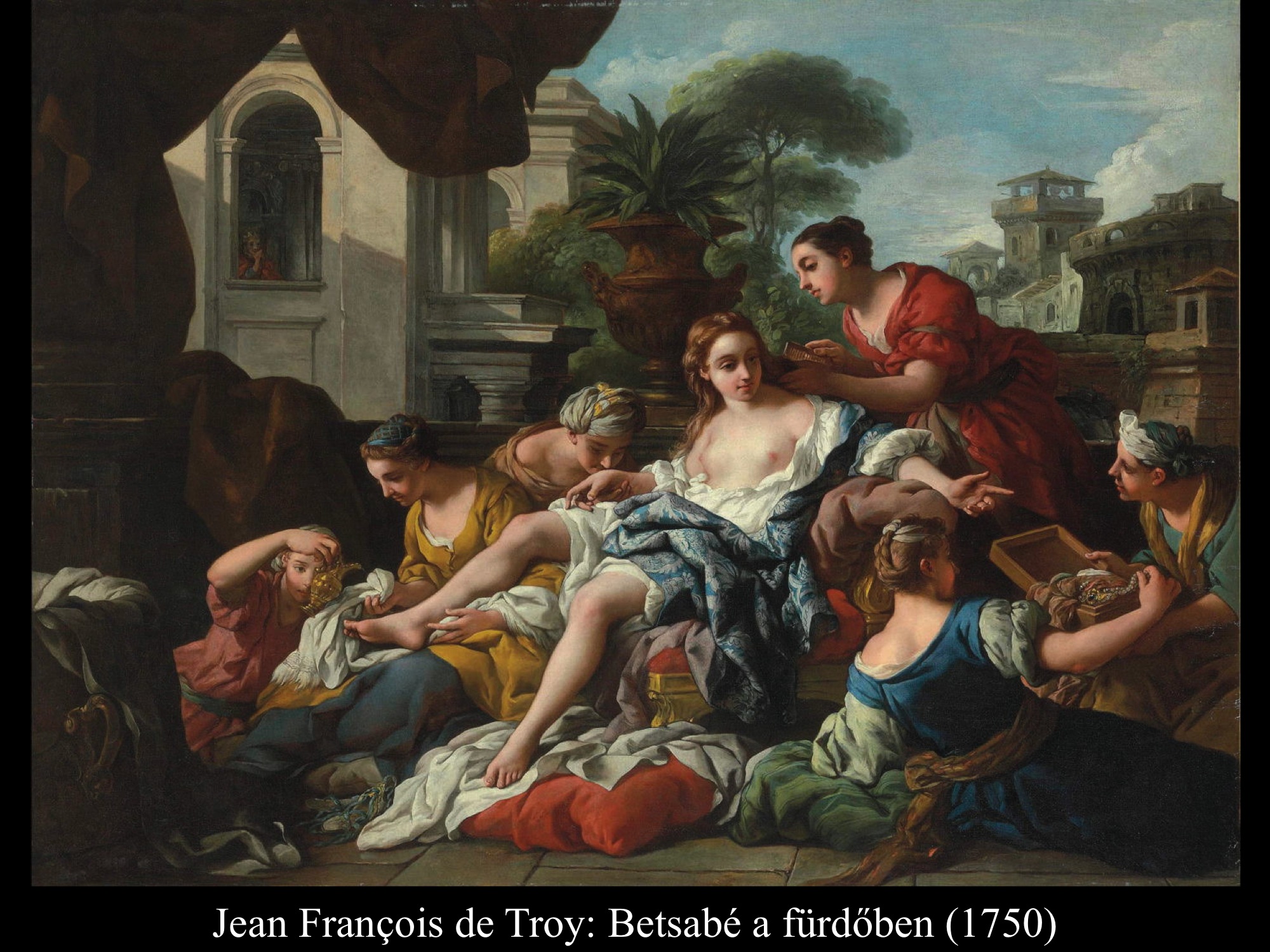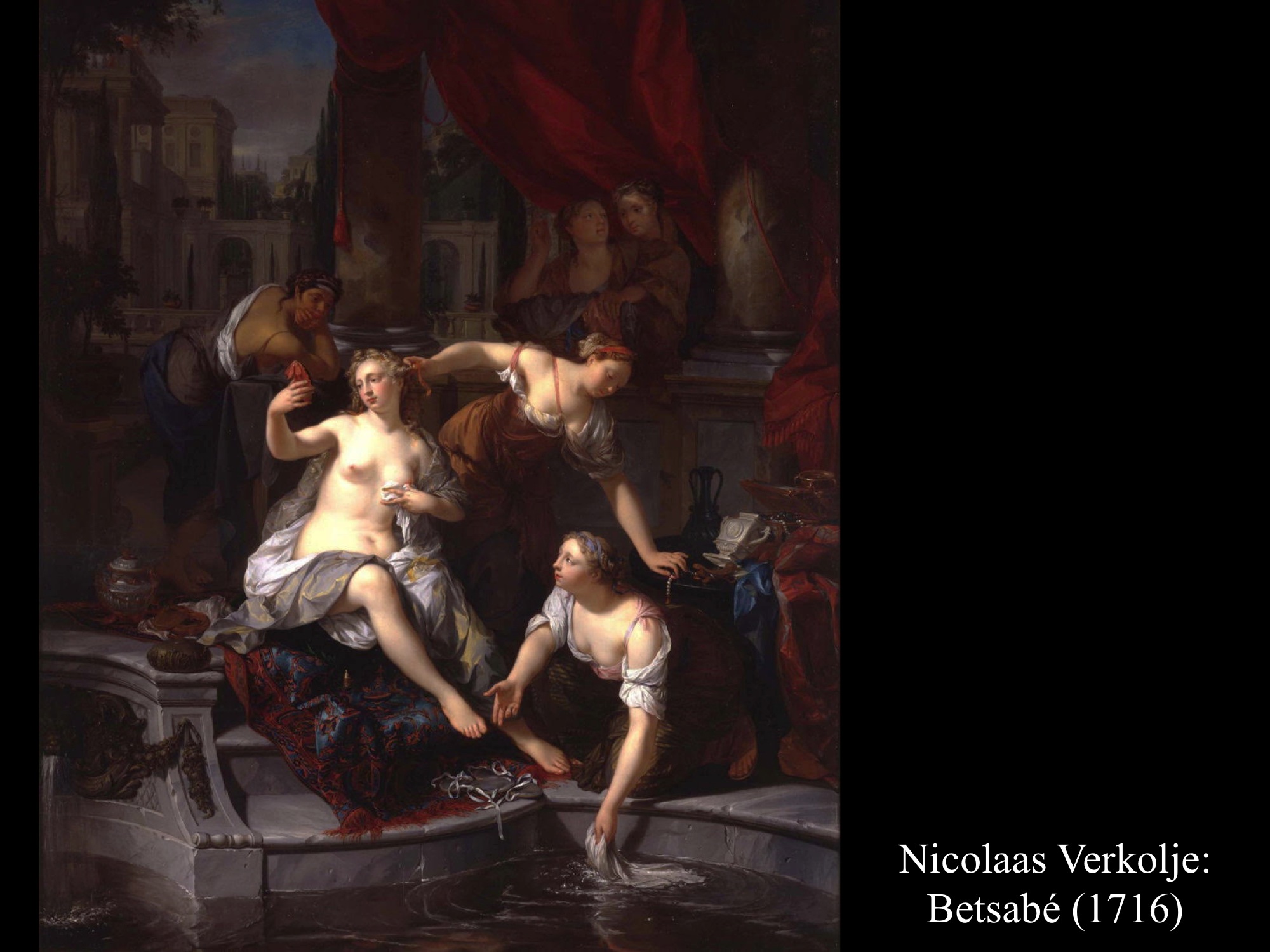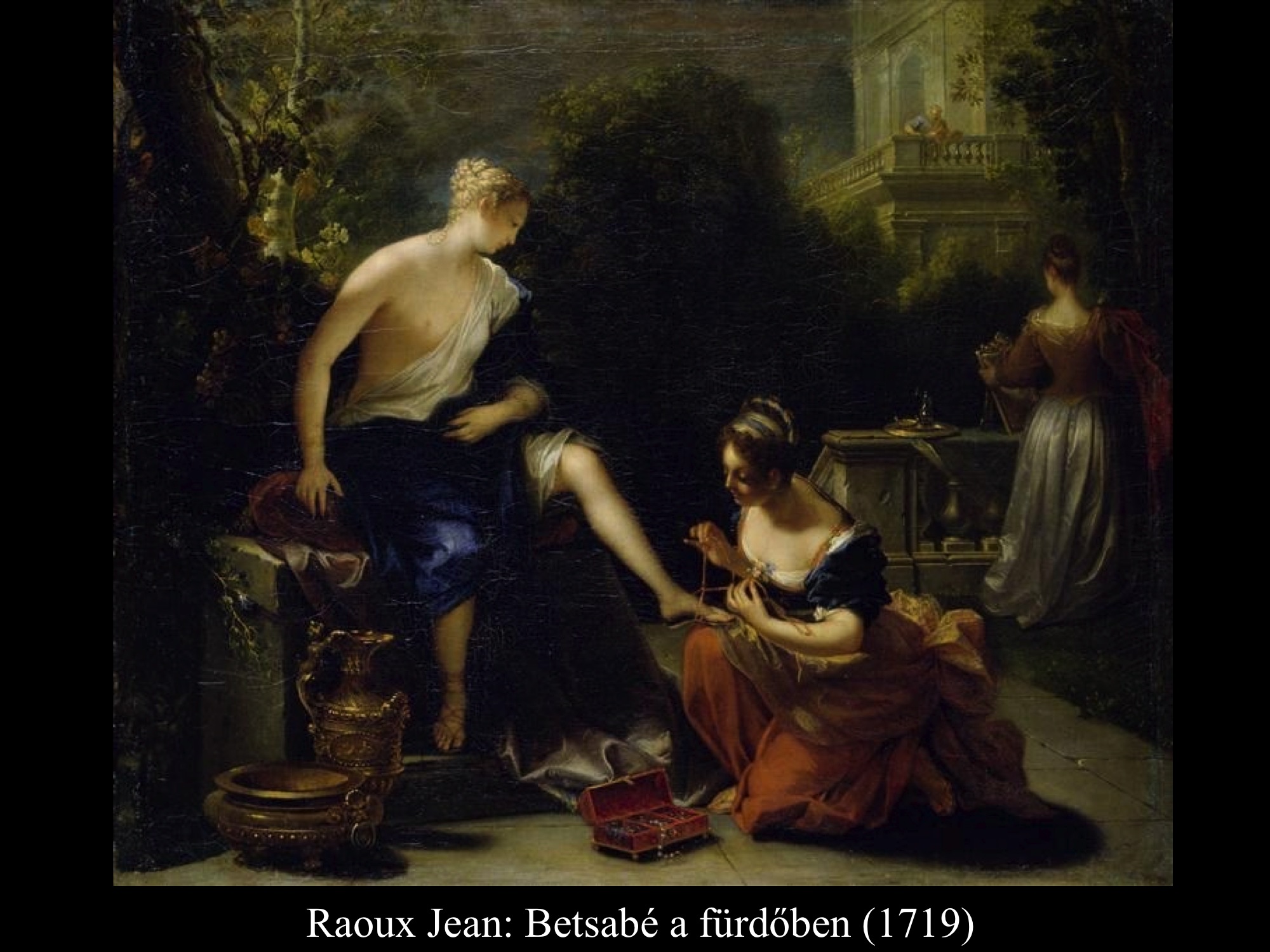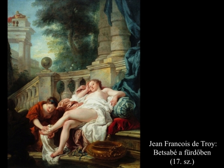 Vajon a fürdés előtt vagy után látjuk Raoux Jean (1719) képén Betsabét? Saruját ki- vagy befűzi szolgálónője? Mivel Dávid levele nem szerepel a kompozíción, így valószínűleg a fürdés előkészületei zajlanak. Betsabé arca viszont szomorú, előrejelzi a történet kimenetelét, a bűnt és férje halálát.
