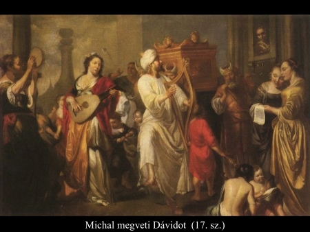 Amikor azonban az Úr ládája bevonult Dávid városába, történt, hogy Saul lánya, Michal kinézett az ablakon. Amikor meglátta, hogy Dávid király ugrál és forog az Úr előtt, szívében megvetette. Az Úr ládáját bevitték, és a sátorban arra a helyre állították, amelyet Dávid kijelölt neki. Akkor Dávid égőáldozatot és közösségi áldozatot mutatott be az Úr előtt, s amikor készen lett az égőáldozatnak és a közösség áldozatának a bemutatásával, megáldotta a népet az Úr nevében. Aztán az egész népnek, Izrael fiai egész seregének, a férfiaknak éppúgy, mint a nőknek kiosztatott egy-egy kenyeret, egy csomó datolyát és egy-egy mazsolás kalácsot. Ezután az egész nép hazament. Amikor Dávid hazatért, hogy családját is megáldja, Saul lánya, Michal, Dávid elé lépett, s azt mondta: „Milyen tiszteletre méltó módon viselkedett ma Izrael királya, amikor szolgái szolgálóinak szeme láttára levetkőzött, ahogy csak a csőcselékből szokott valaki levetkőzni!” Dávid így válaszolt Michalnak: „Az Úr előtt táncoltam! Az Úr életére, aki engem atyád és egész háza helyett kiválasztott, s megtett fejedelemnek az Úr népe, Izrael fölött: Az Úr előtt igenis táncolok. Sőt, még jobban megalázkodom, mint most, akkor is, ha a te szemedben megvetésre méltó vagyok is. Mert a szolgálók körében, akiket említettél, azok körében tiszteletet váltok ki.” Michalnak, Saul lányának egész halála napjáig nem lett gyermeke. (2Sám 6,16-23)