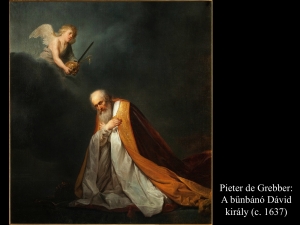 Miután számba vétette a népet, Dávidnak megdobbant a szíve. Így szólt hát az Úrhoz: „Nagy bűnt követtem el. De bocsásd meg, Uram, szolgádnak ezt a bűnt, mert ostobaságot csináltam.” Amikor Dávid reggel fölkelt, az Úr ezt a szózatot intézte Dávid látóemberéhez, Gád prófétához: „Menj és add tudtára Dávidnak: Ezt mondja az Úr: Hármat mondok, aztán amit választasz, azt teszem veled!” Gád elment Dávidhoz és tudtára adta. Így szólt: „Jöjjön-e három évig tartó éhínség büntetésül az országra? Vagy azt akarod, hogy három hónapon át menekülj ellenséged elől, ő meg üldözzön? Vagy legyen három napig pestis országodban? Gondolkozz rajta, s mondd meg, milyen választ vigyek annak, aki küldött!” Erre Dávid azt felelte Gádnak: „Nagy szorultságban vagyok… Inkább kerüljünk az Úr kezébe, hiszen nagy az irgalma. De emberek kezétől nem szeretnék elveszni.” Így hát Dávid a pestist választotta.Épp a búza aratásának volt az ideje. Akkor az Úr pestist küldött Izraelre, reggeltől a megszabott időre. A csapás lesújtott a népre, és hetvenezren meghaltak a népből Dántól egészen Beersebáig. Amikor azonban az angyal Jeruzsálem felé is kinyújtotta kezét, hogy elpusztítsa, az Úr megbánta ezt a csapást, és megparancsolta az angyalnak, aki lesújtott a népre: „Most aztán elég! Húzd vissza a kezed!” Az Úr angyala éppen a jebuzita Arauna szérűjénél volt. Amikor Dávid látta az angyalt, aki lesújtott a népre, így könyörgött az Úrhoz: „Én vétkeztem, én követtem el gonoszságot! Ezek, a nyáj, mit vétettek? Ezért hát forduljon kezed ellenem és házam ellen!” (2Sám24,10-17)