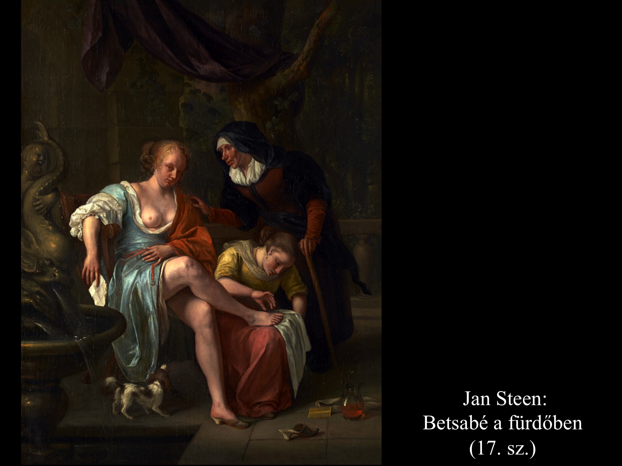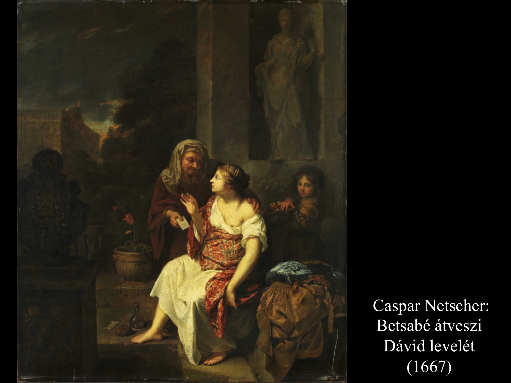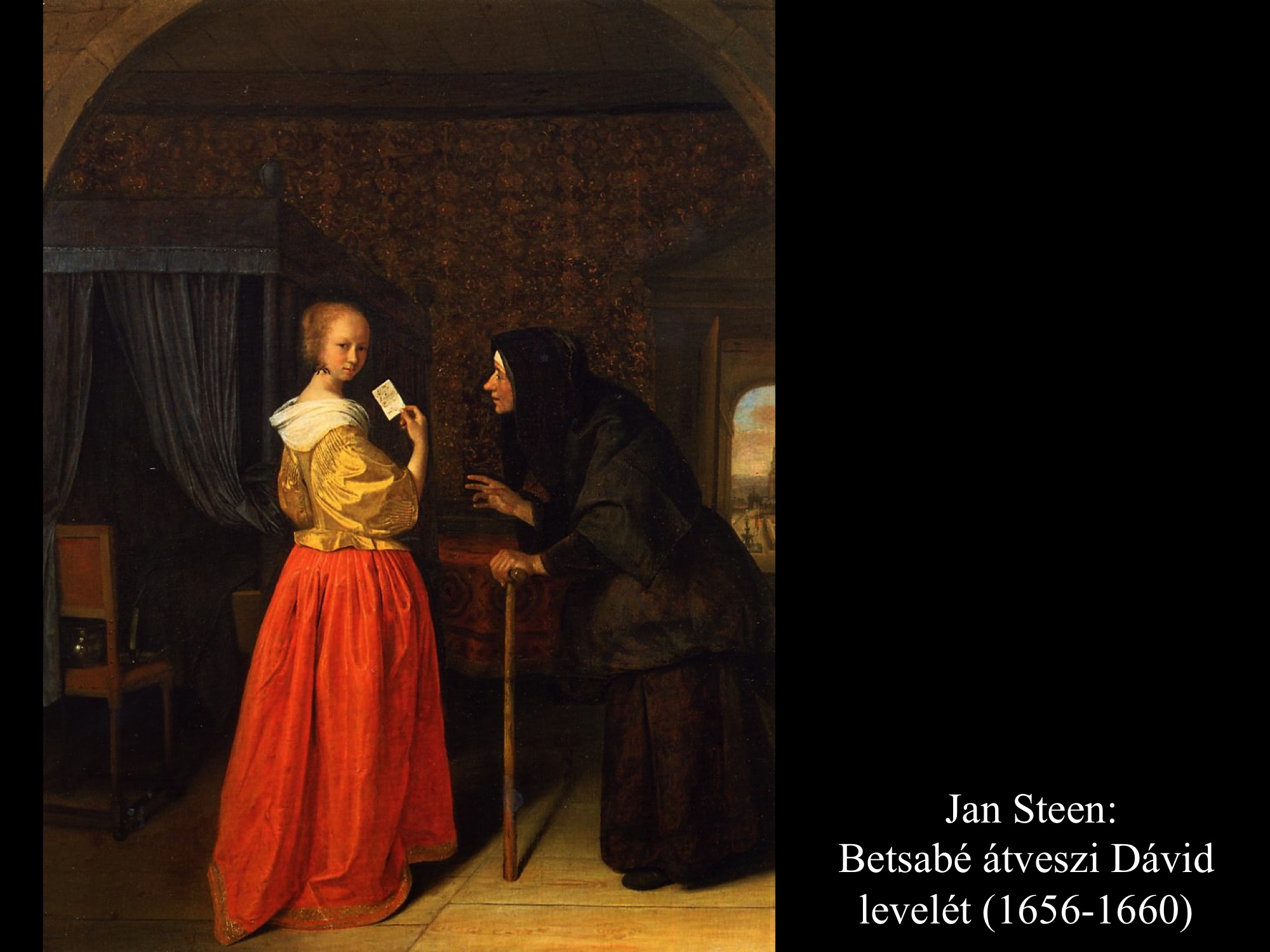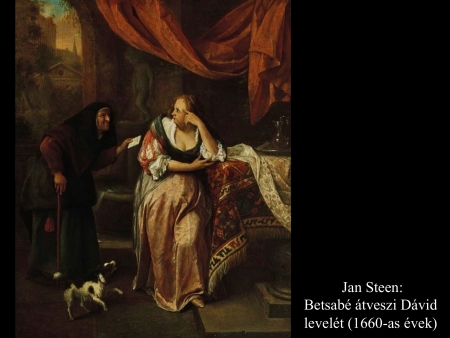 Caspar Netscher (1667) és Jan Steen (1660-as évek) festményei eltérnek az eddig látott Betsabé-ábrázolásoktól a környezet, az öltözet s a "postás" tekintetében is. Steen képein egy fejkendős, bottal közlekedő vénasszony érkezik a levéllel.