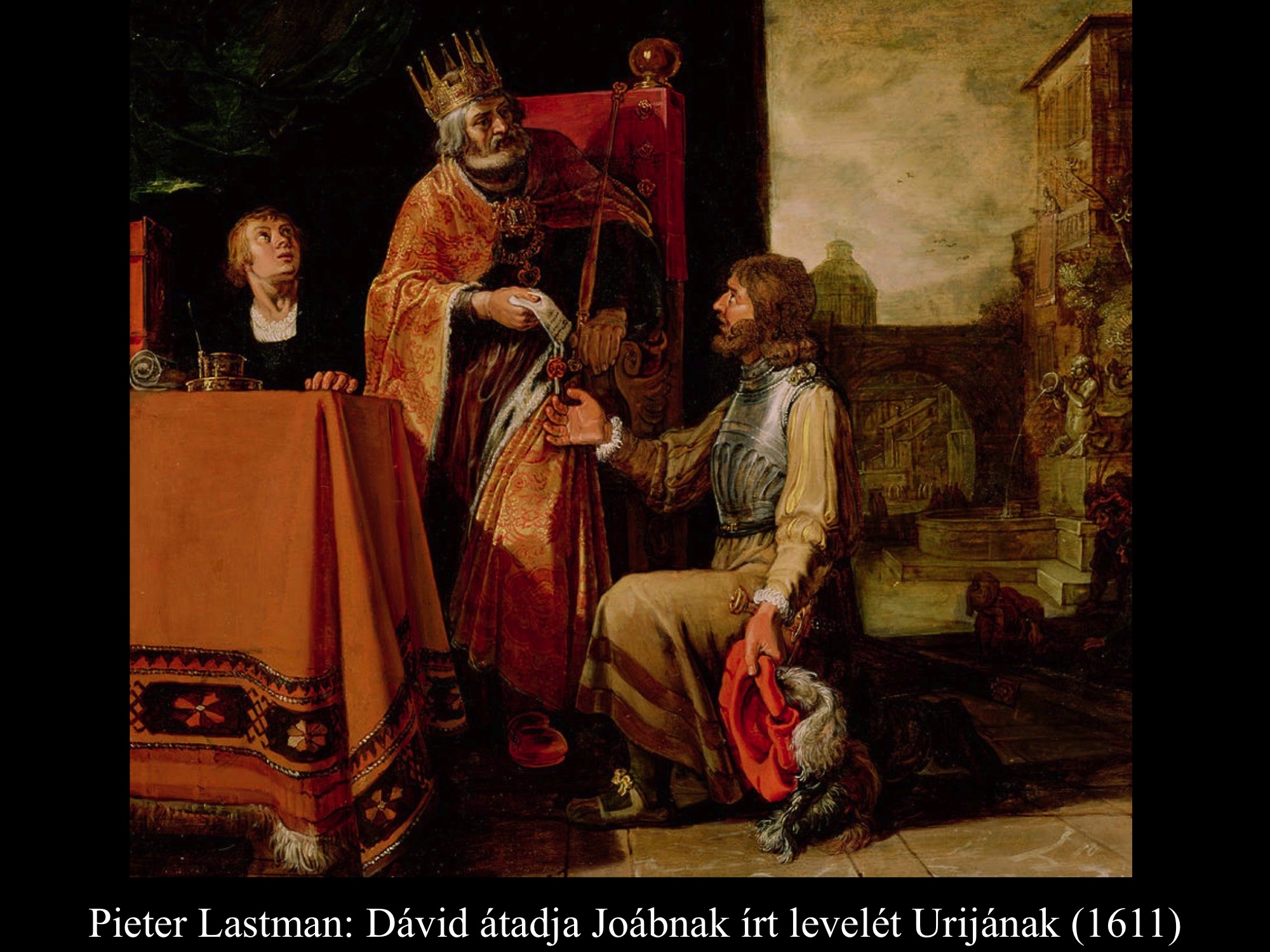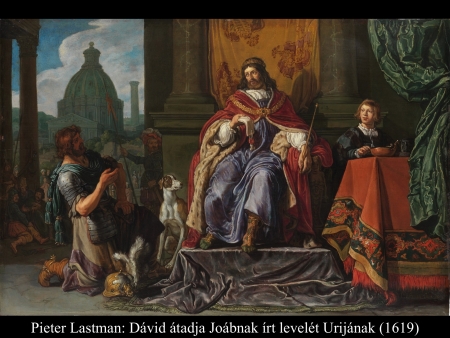 Pieter Lastman (1611,1619) és Jacob Adriaensz Backer (17. sz.) festményein Urija a saját halálos ítéletéről szóló levelet veszi át Dávid királytól.