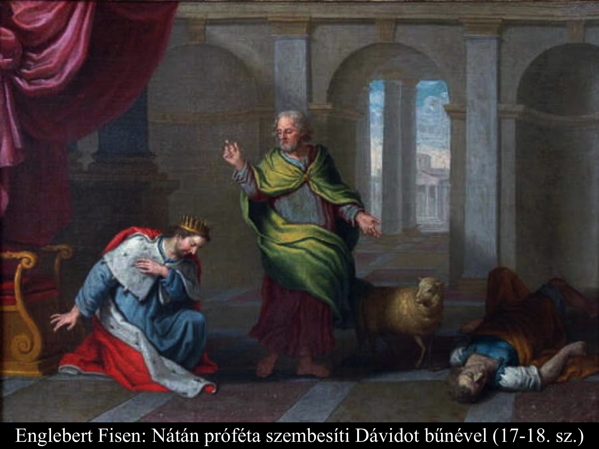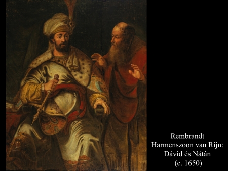 Akkor az Úr elküldte Nátán prófétát Dávidhoz. El is ment hozzá, és így beszélt: „Egy városban élt két ember. Az egyik gazdag volt, a másik szegény. A gazdagnak rengeteg juha, kecskéje és barma volt. A szegénynek azonban nem volt egyebe, csak egy kis báránya, vette magának. Etette, úgyhogy megnőtt, vele magával és gyermekeivel. Evett a kenyeréből és ivott a poharából. Az ölében aludt, s olyan volt, mintha a lánya lett volna. Egyszer vendég érkezett a gazdag emberhez. De nem tudta rászánni magát, hogy a juhai vagy barmai közül egyet is elvegyen, és a vendégnek, aki érkezett, elkészítse. Ezért elvette a szegény ember báránykáját, és azt készítette el vendégének.” Dávid nagyon megharagudott az emberre, és azt mondta Nátánnak: „Amint igaz, hogy az Úr él: az az ember, aki ilyet tesz, az a halál fia. A bárányt négyszeresen vissza kell fizetnie, amiért így tett, és nem volt kímélettel.” Erre Nátán így szólt Dávidhoz: „Magad vagy ez az ember! Ezt mondta hát az Úr, Izrael Istene: Fölkentelek Izrael királyává és kiszabadítottalak Saul kezéből. Neked adtam urad házát és a kebledre urad asszonyait, rád bíztam Izrael házát és Júda házát. S ha ez kevés lett volna, még megtetéztem volna ezzel meg azzal. Miért vetetted hát meg az Urat, s tettél olyat, ami gonosznak számít az Úr szemében? Kard által elveszítetted a hettita Uriját, hogy feleségül vedd a feleségét. Igen, elveszítetted az ammoniták kardja által! Nos, a kard sose fordul el házadtól, amiért megvetettél, és elvetted a hettita Urijától a feleségét, hogy a te asszonyod legyen. Ezt mondta az Úr: Nos, a saját házadból hozok rád romlást. Elveszem a szemed láttára asszonyaidat és odaadom őket másvalakinek, hogy napvilágnál asszonyaiddal háljon. Te titokban tetted, de én egész Izrael szeme láttára, napvilágnál viszem ezt végbe!” Erre Dávid így szólt Nátánhoz: „Vétkeztem az Úr ellen!” Nátán ezt válaszolta Dávidnak: „Így az Úr is megbocsátja bűnödet, s nem halsz meg. De mert ezzel a tetteddel káromoltad az Urat, a fiú, aki született neked, meghal.” Ezzel Nátán elment haza. (2Sám12,1-15)