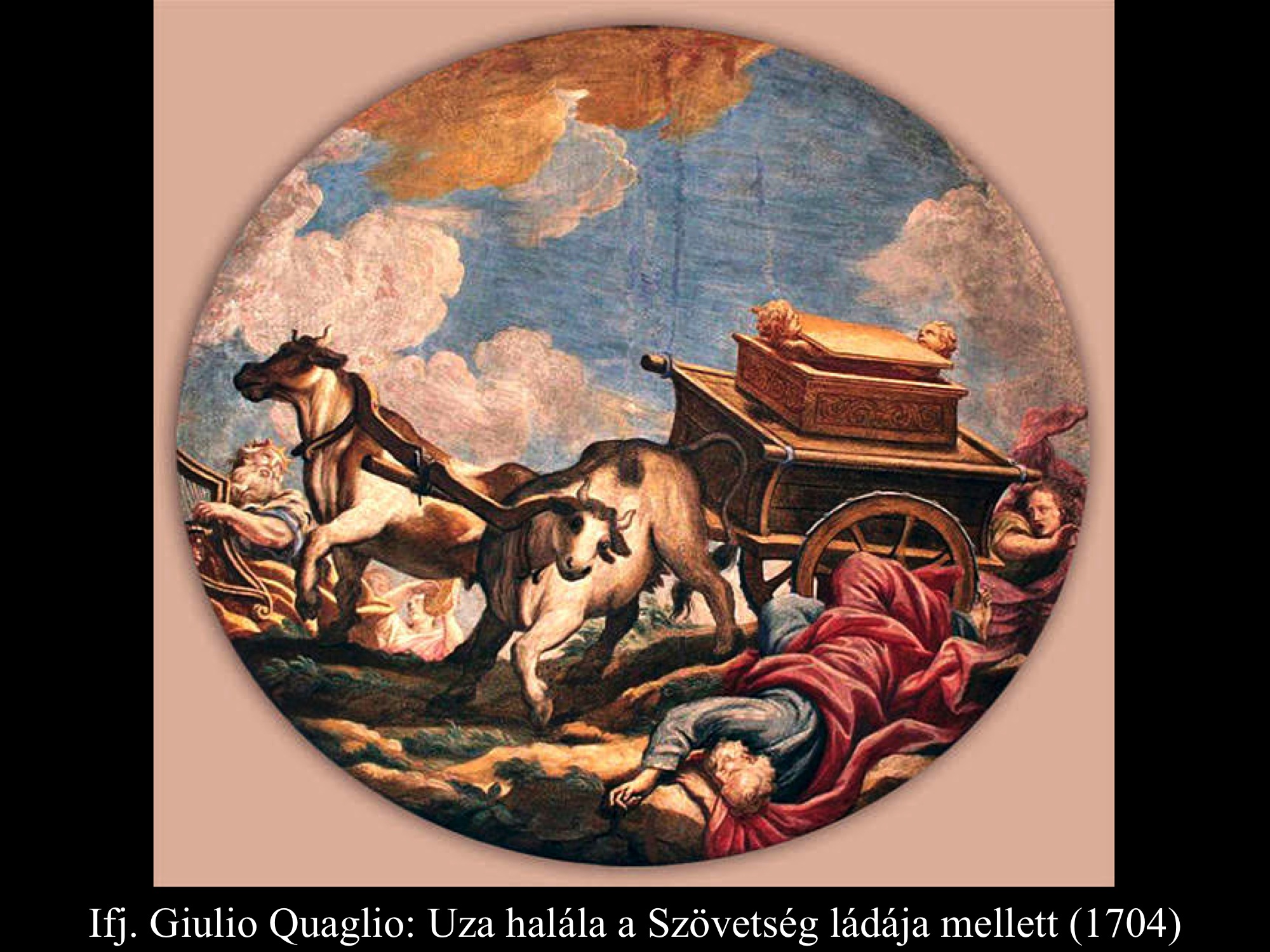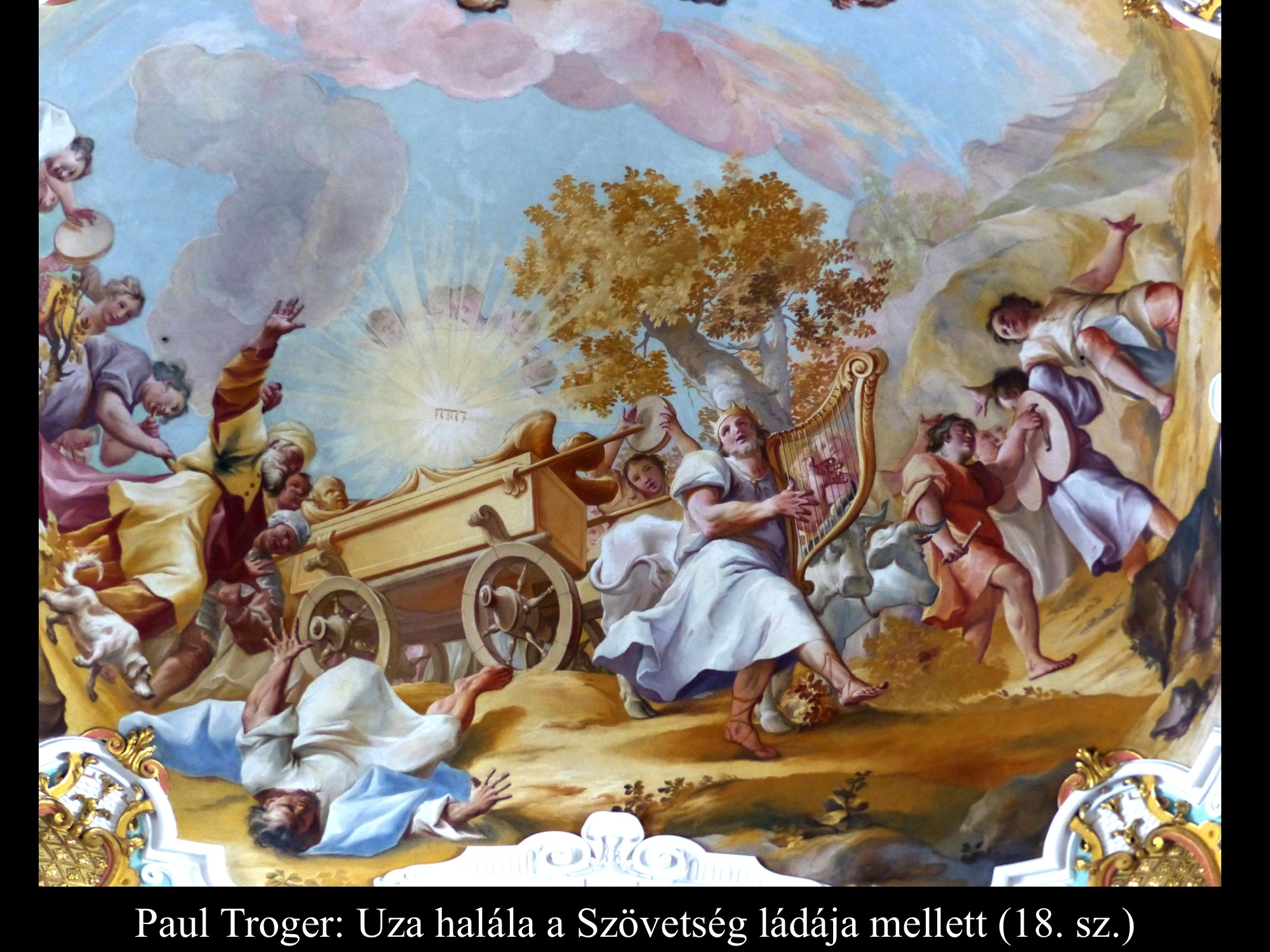 Paul Troger (18. sz.) és Ifj. Giulio Quaglio (1704) falképein Uza halála látható a Szövetség ládája mellett.