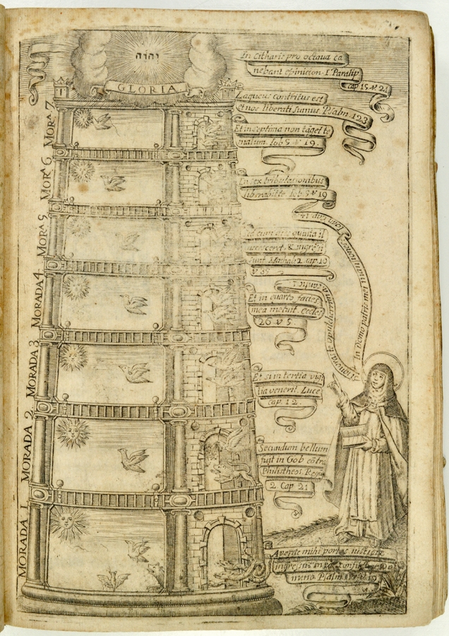 Avilai Szent Teréz (1515–1582) a keresztény misztika legismertebb női alakja. “Az emberi lelket úgy képzeli el, mint egy gyémántból vagy különleges tisztaságú kristályból készült várkastélyt, amelyben sok szoba van, amint az égben is sok lakás. … A várkastélyban középen van a legfőbb lakás, „ahol nagyon titokzatos dolgok történnek Isten és a lélek között.” Teréz hangsúlyozza: Isten úgy alkotta meg az ember természetét, hogy mindenki képes befogadni azokat a természetfölötti kegyelmeket, amelyek lehetővé teszik a Vele való személyes kapcsolatot. Senki nincs ebből eleve kizárva. … Teréz azt vizsgálja, minként léphetünk be „a mi szép és gyönyörűséges” várkastélyunkba. Sok lélek van ugyanis, aki a vár körítő falán tartózkodik, s egyáltalán nem tartja fontosnak, hogy beljebb jusson. Az a kapu, amelyen át beléphetünk ebbe a várkastélyba, az imádság és az elmélkedés. Teréz hét lakást különböztet meg a lélek várkastélyában, amelyek különböző távolságra vannak Istentől.”[10] Juan de Rojas y Ausa (1620-1685) spanyol művész illusztrációja egy tornyot ábrázol, a nap irányába repülő hét madárral. Minél magasabbra lép a lélek, annál közelebb kerül a madár a fényhez, a lélek a Mennyországhoz.