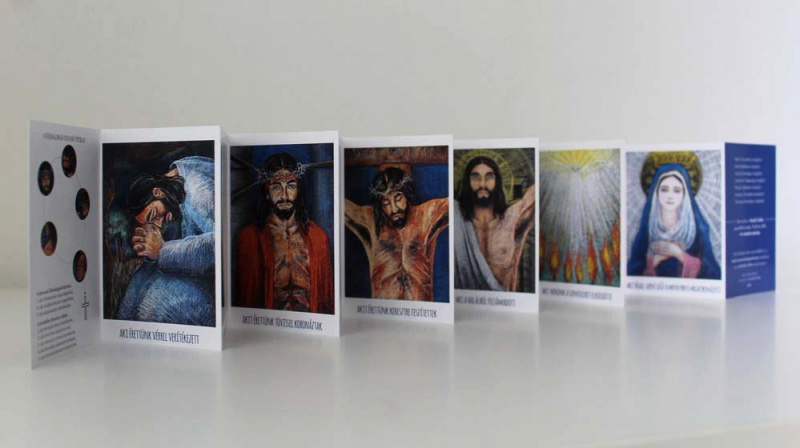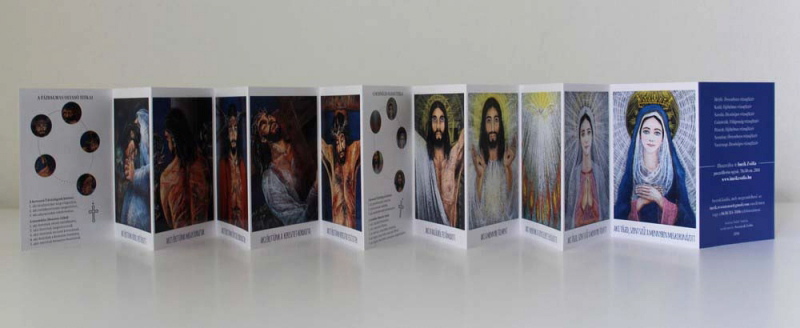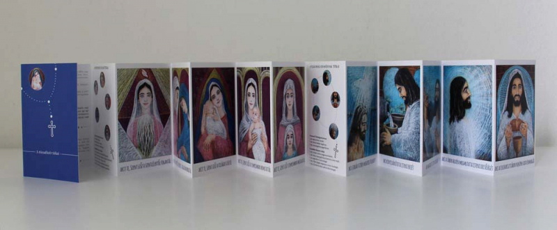 A leporelló másik oldalán a Fájdalmas és a Dicsőséges rózsafüzérek 5-5 titkának illusztrációja látható. Mindkét rózsafüzér kép-