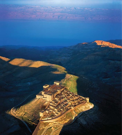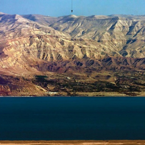 "Az előtérben a Holt-tenger keleti partján fekvő ókori oázis, Kallirrhoe (a mai ez-Zara). A nyíl a machaerusi régészeti lelőhelyet jelöli, mely sasfészekként ékesíti a horizontot. Kilátás az izraeli tengertpart felől." (Forrás: http://www.magyarszemle.hu/galeria/2016_4)
