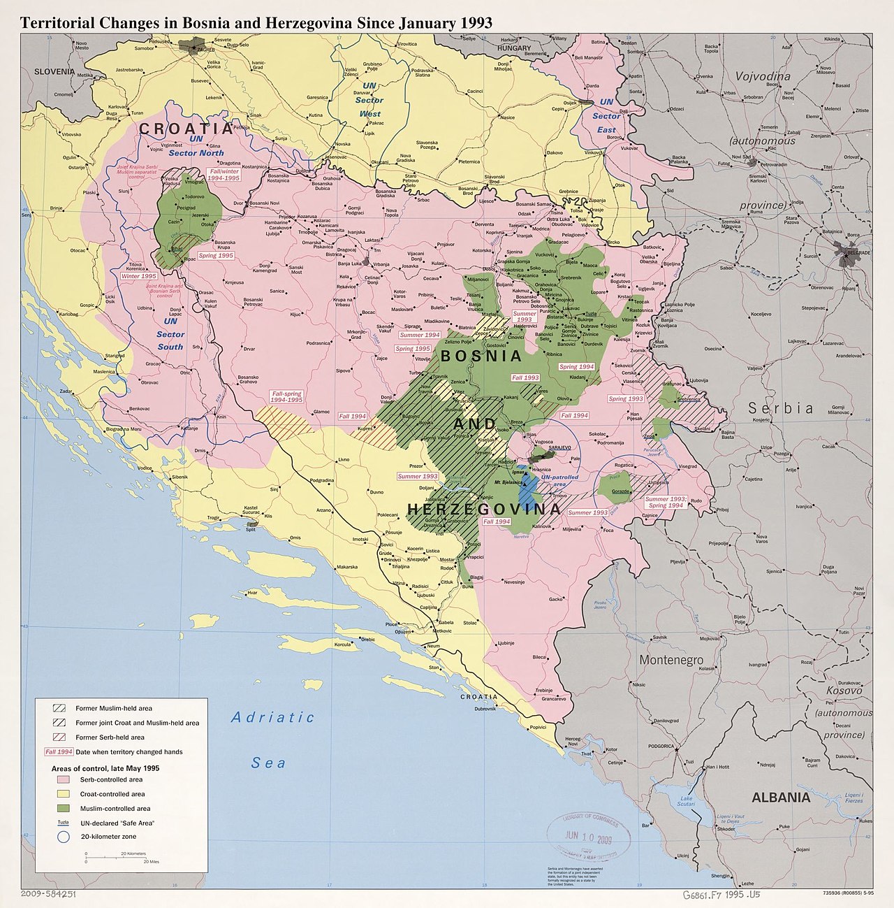 "A boszniai háború 1992–1995 között a Bosznia-Hercegovinában élő bosnyákok, szerbek és horvátok között Jugoszlávia és Horvátország beavatkozásával folytatott polgárháború. A balkáni háború legszörnyűbb szakasza, mintegy 97 000 ember életét kioltó konfliktus. Az áldozatok kevesebb mint felét kitevő civilek 83%-a muszlim, 10%-a szerb és 5%-a pedig horvát nemzetiségű volt. Pusztán vallási és etnikai hovatartozásuk miatt gyilkoltak meg több ezer embert. A háborúban részt vevő mindegyik náció hallatlan kegyetlenkedéseket követett el a másik kettő polgári lakossága ellen."3 A térképen a háborúban elfoglalt területek láthatók 1993. januárjában.4