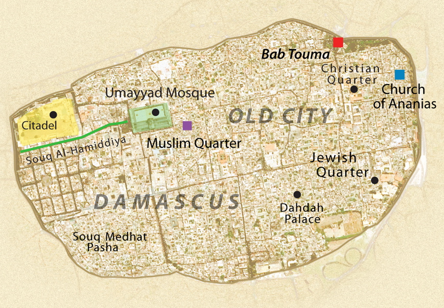 Damaszkusz ősi városa, melyet az ókorban csak Shámnak neveztek, feltehetőleg a világ legrégebb óta folyamatosan lakott települése. I.e. 4000 körül már lakták, de csak az i. e. 2. évezred folyamán vált jelentős kereskedelmi központtá. Hol Egyiptom,  hol Mitanni fennhatósága alatt állt, majd a hettita befolyás után önállóságra tett szert, mígnem az asszírok kiterjesztették rá hatalmukat. A várost Kr. e. 38-ban szerezték meg a rómaiak, később (661-től) az  Arab Birodalom fővárosa lett. A későbbiekben még sokszor cserélt birtokost. Óvárosa a szíriai háború mindennapossá vált bombatámadásaiban megrongálódott.